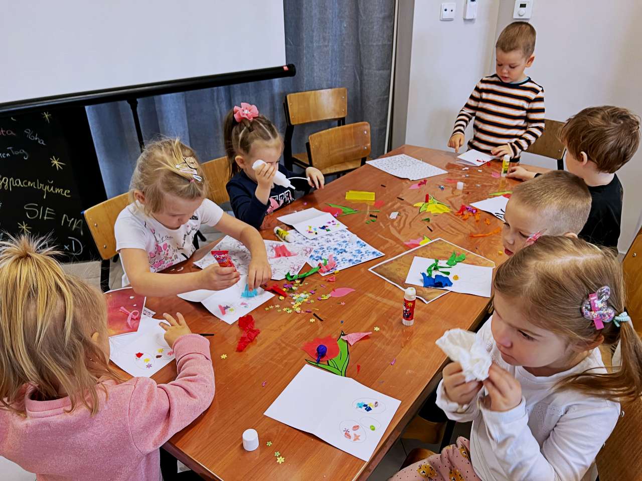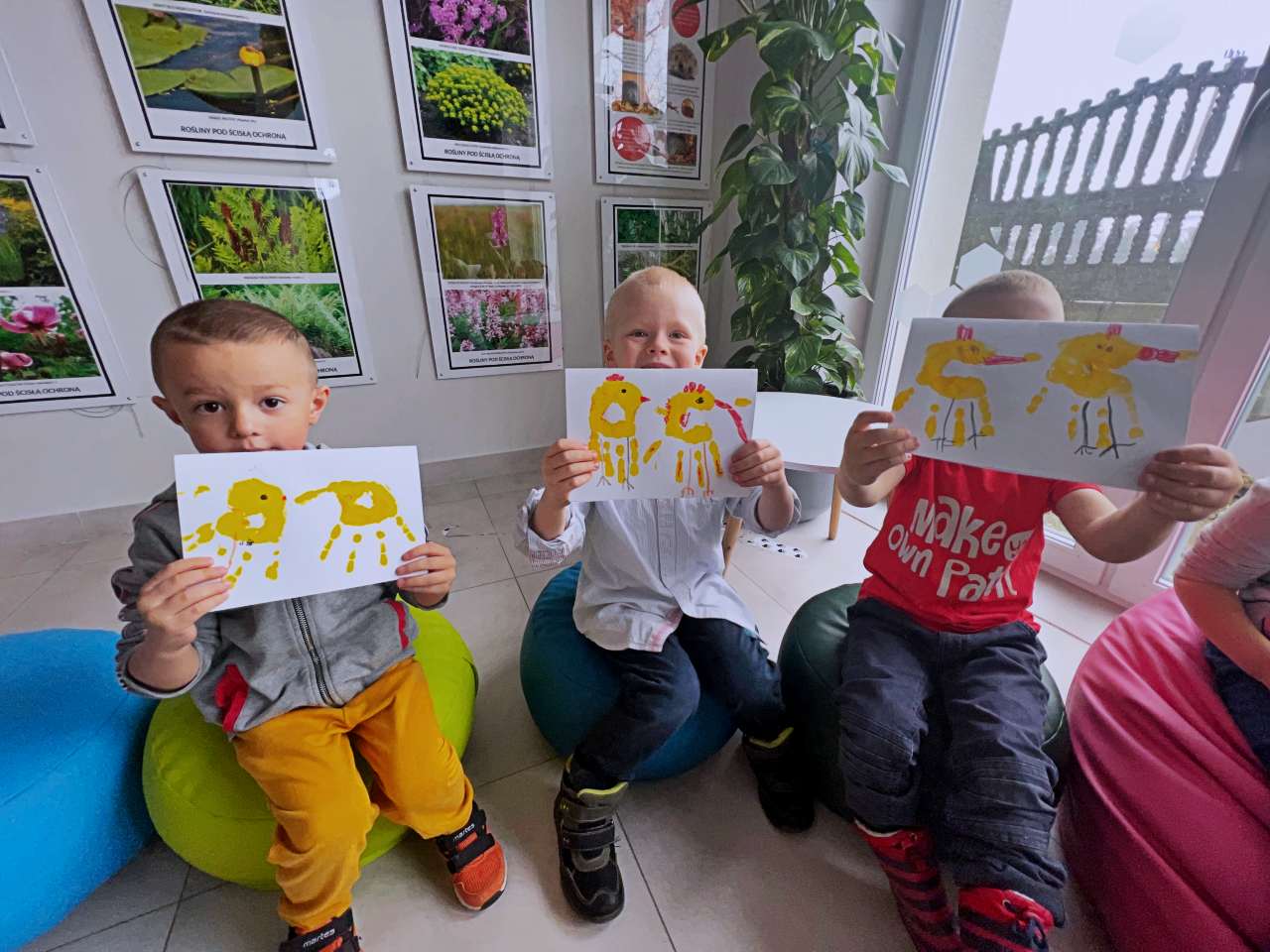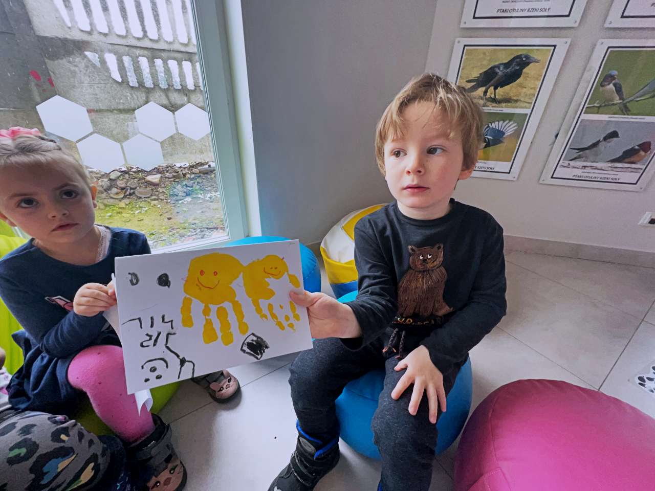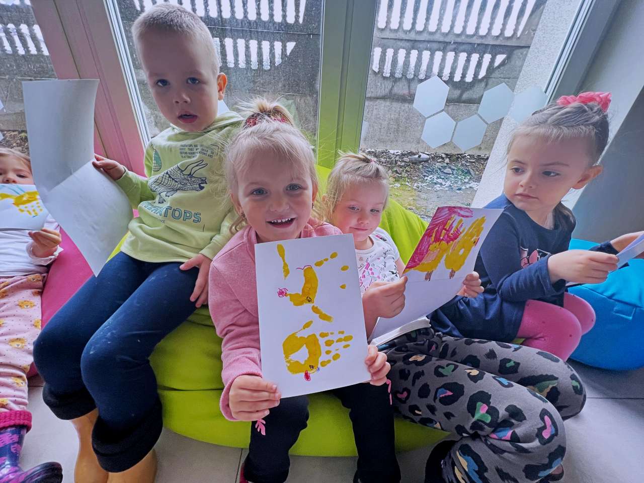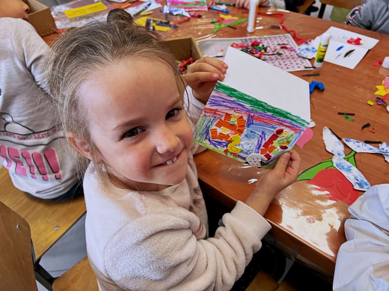 Wraz z grupą przedszkolaków z Przedszkola Publicznego w Wieprzu stworzyliśmy piękne kartki technika kolażu. Do wykonania kartek użyliśmy bibuły, starych gazet, kredek i własnych paluszków. W trakcie zajęć poznawaliśmy ptaki z zagrody naszych dziadków: gęsi, kury, indyki, perliczki i kaczki.