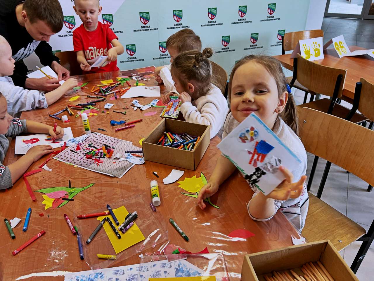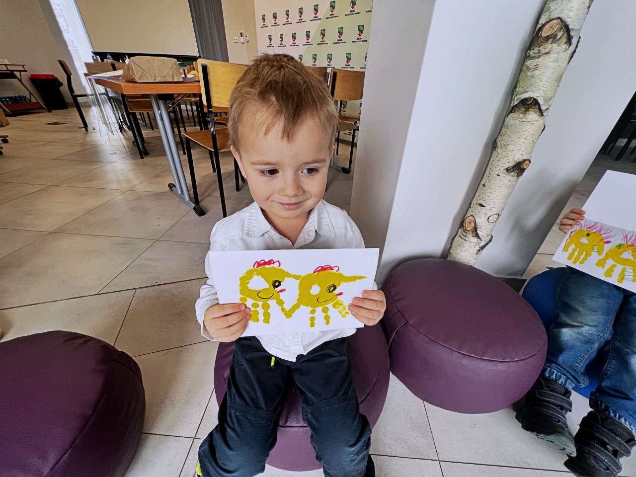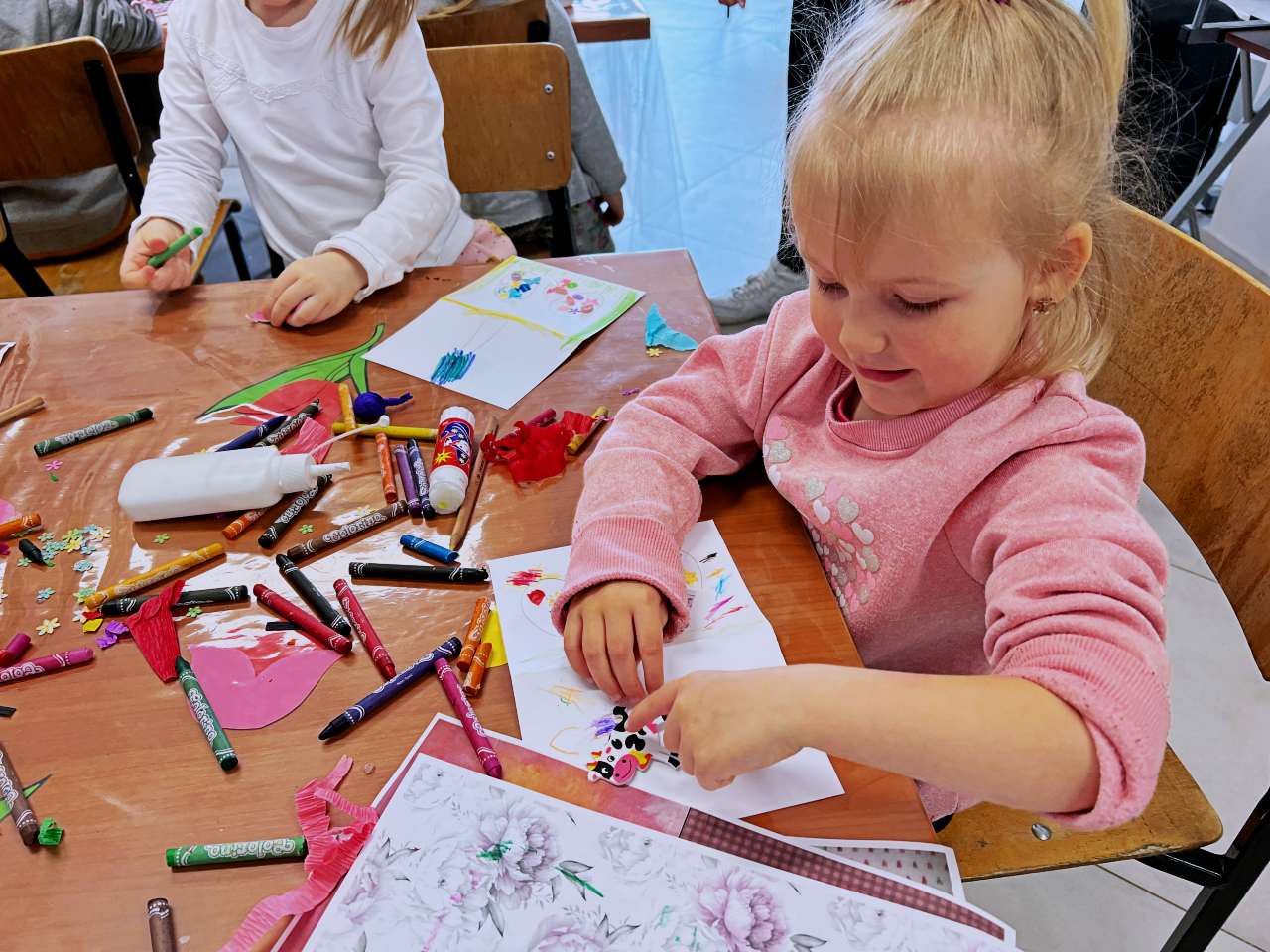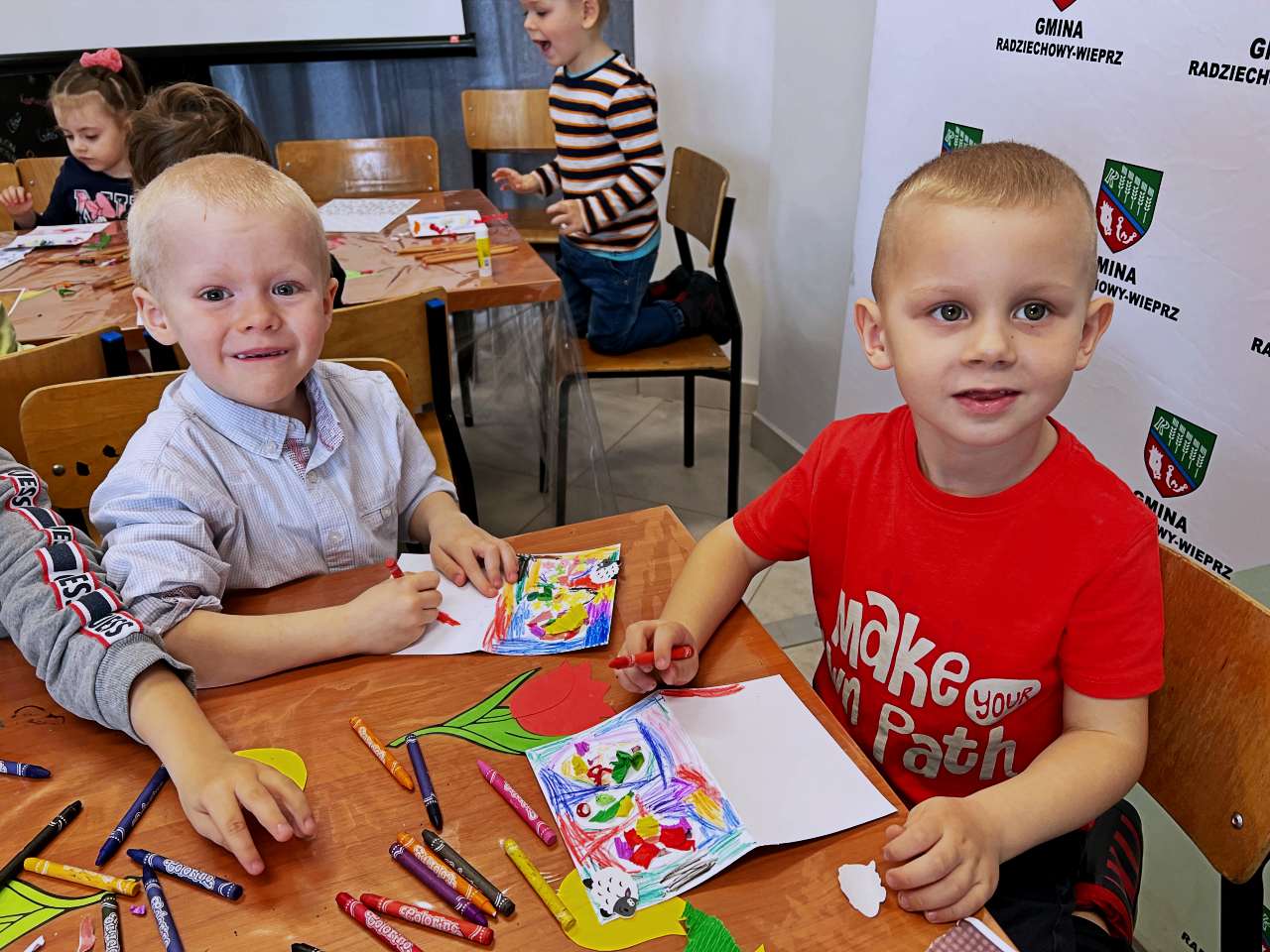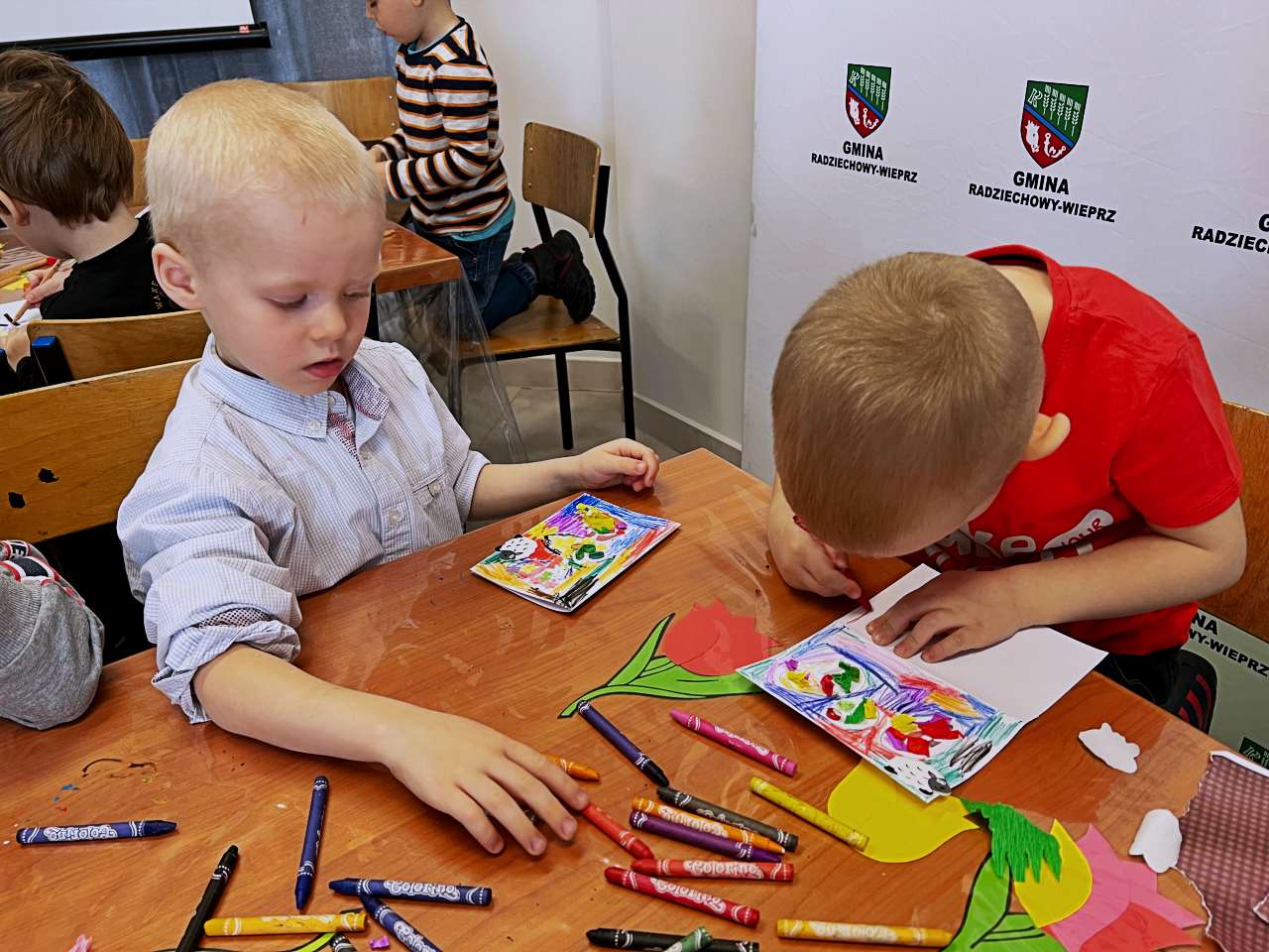 Wraz z grupą przedszkolaków z Przedszkola Publicznego w Wieprzu stworzyliśmy piękne kartki technika kolażu. Do wykonania kartek użyliśmy bibuły, starych gazet, kredek i własnych paluszków. W trakcie zajęć poznawaliśmy ptaki z zagrody naszych dziadków: gęsi, kury, indyki, perliczki i kaczki.