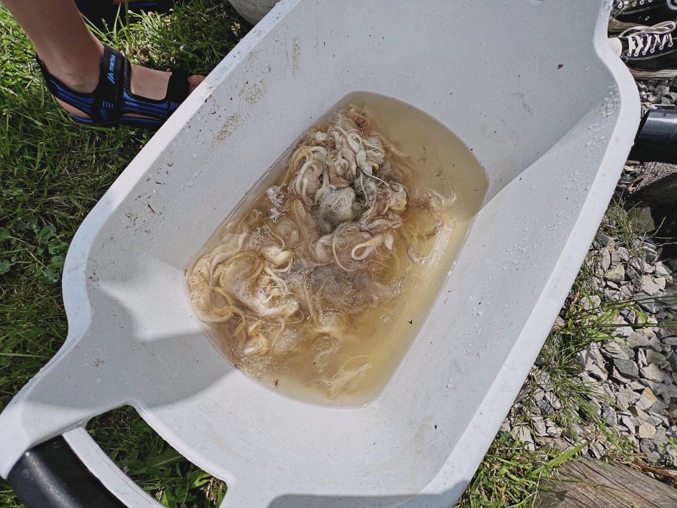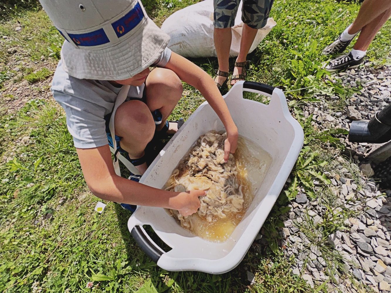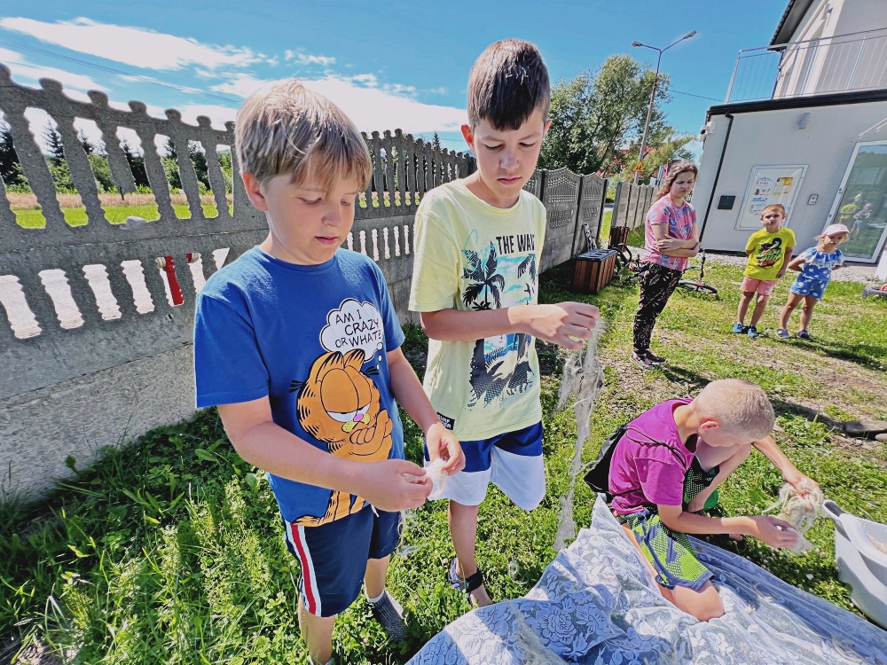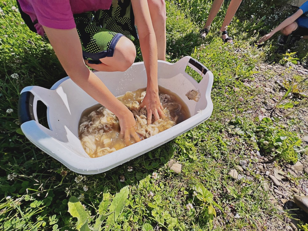 Podczas zajęć uczyliśmy się prać wełnę, co sprawiło dzieciakom wiele radości i doznań w szczególności zapachowych. Wełna to specyficzne „tworzywo”, które po ścięciu bywa nieco problematyczne. Pranie wełny okazało się być ciekawym zajęciam i mimo wszystko bardzo przyjemnym.