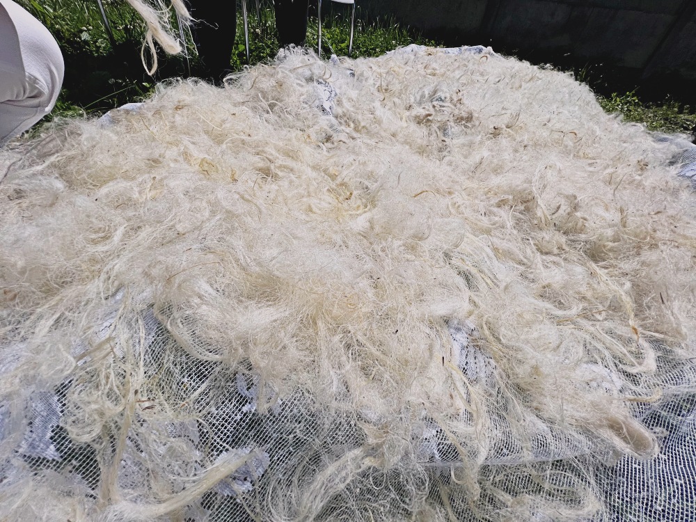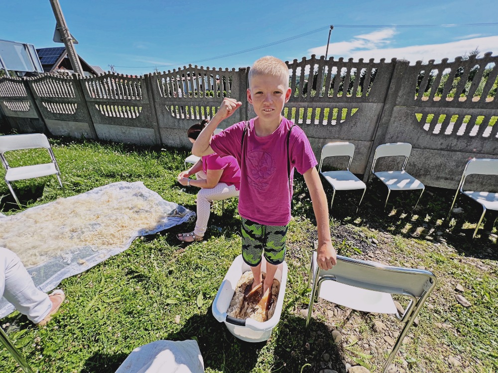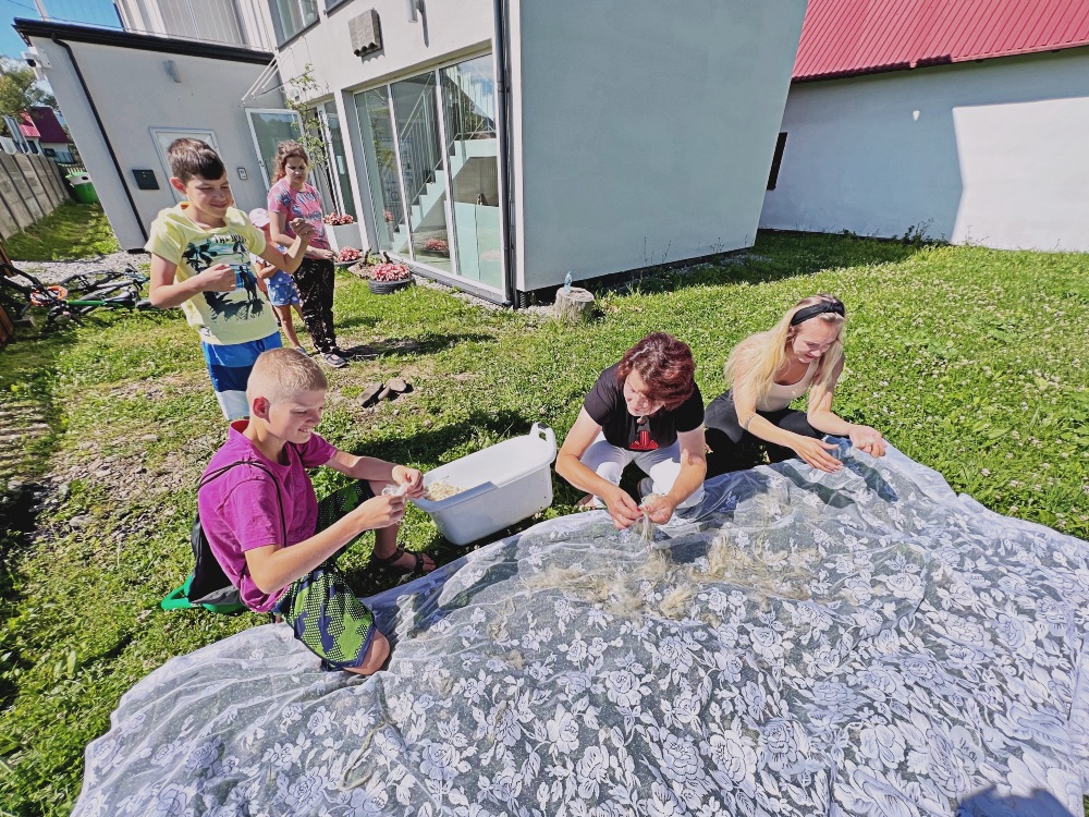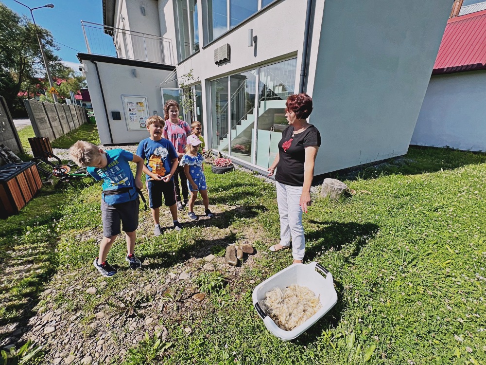 Po praniu należało wełnę „wycerchać”, co już nie było dla niektórych takie przyjemne. Na szczęście na pomoc przyszły panie z Gminnego Centrum Kultury, Promocji, Turystyki Radziechowy-Wieprz, dzięki którym ta ogromna ilość wełny szybko została przerobiona. Mogła spokojnie wyschnąć na słońcu, by na następnych zajęciach móc ją „kręplować”.