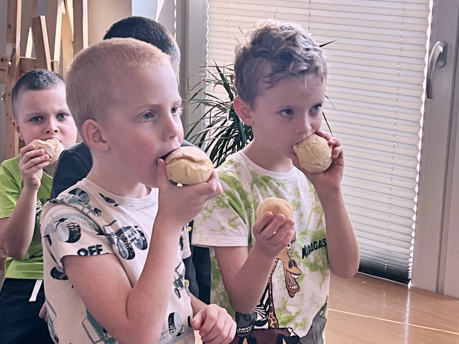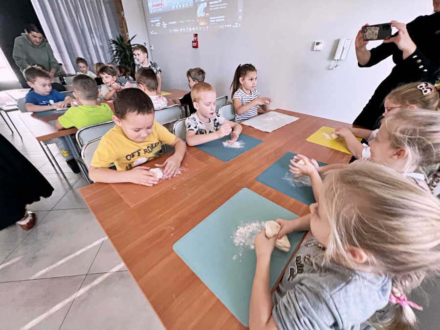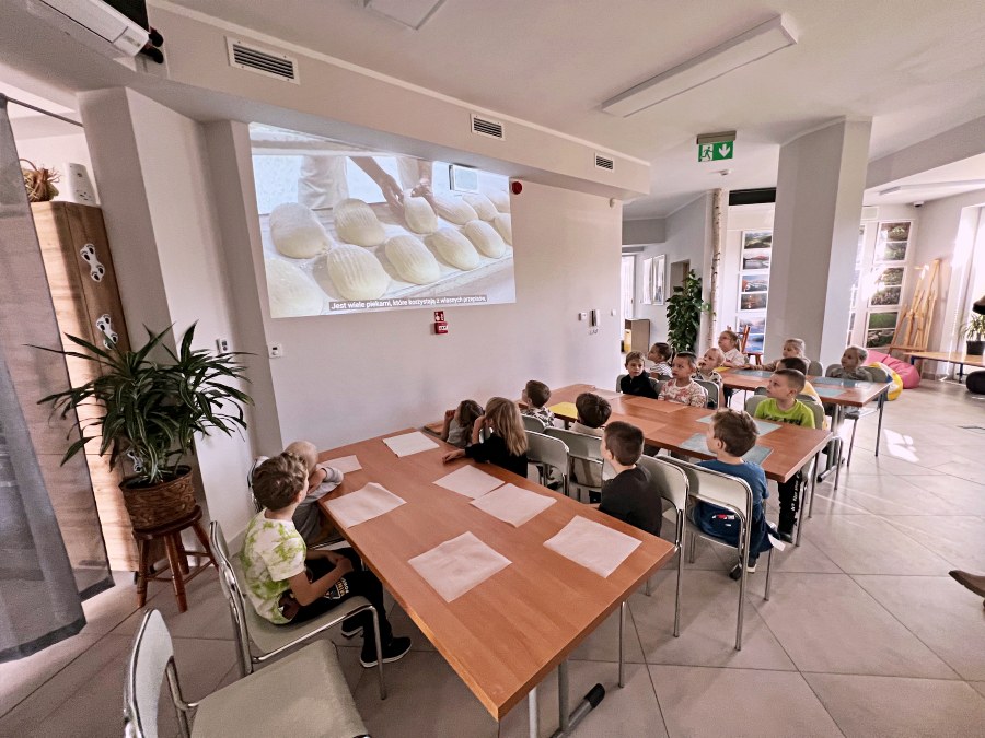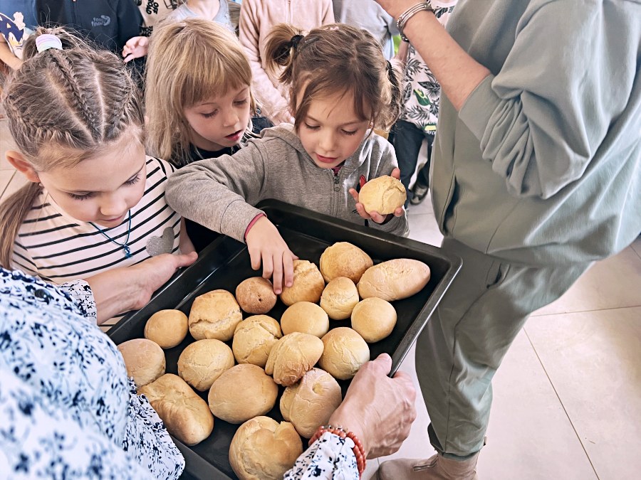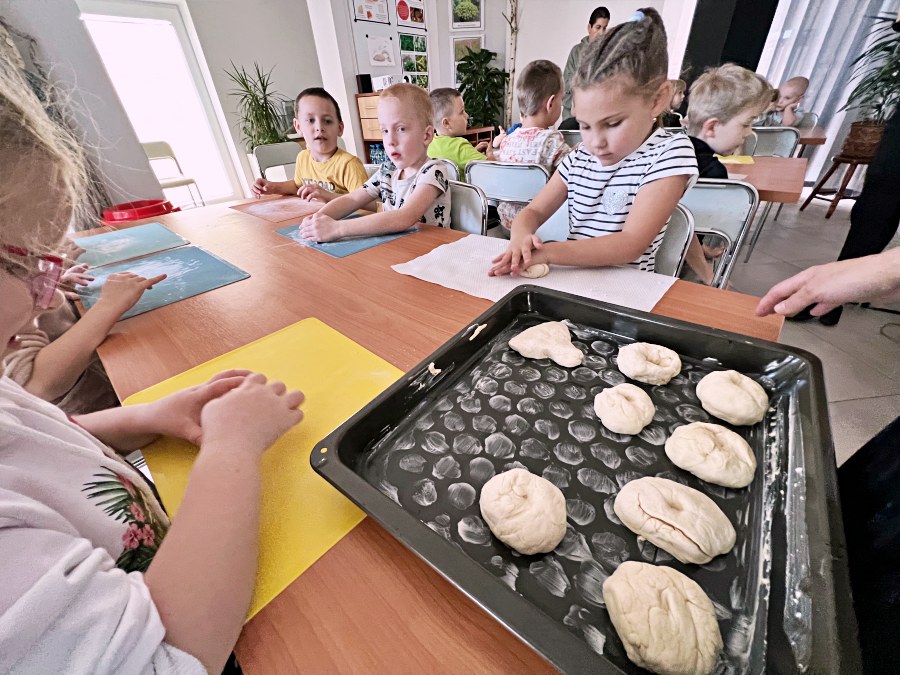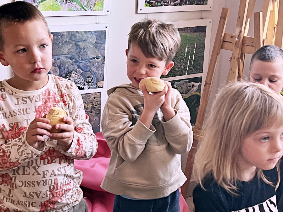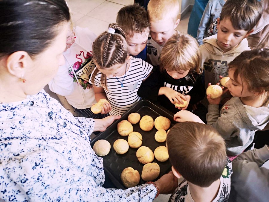 Pieczemy bułeczki z podopiecznymi Przedszkola z Bystrej. Oj wyszły smaczne. Każdy miał okazję uformować swój wyjątkowy kształt bułki. Do tego poznaliśmy zawód piekarza. Zobaczyliśmy jak wyglądała piekarnia tradycyjna i jak wygląda nowoczesna. Dzieci najedzone i szczęśliwe.