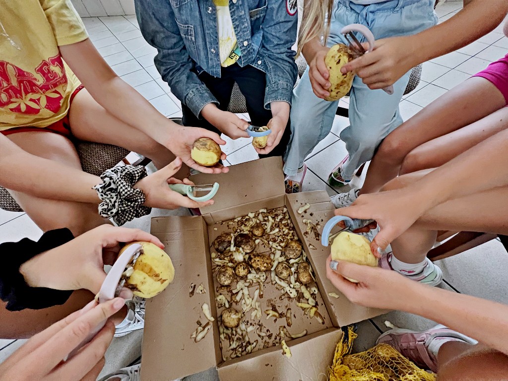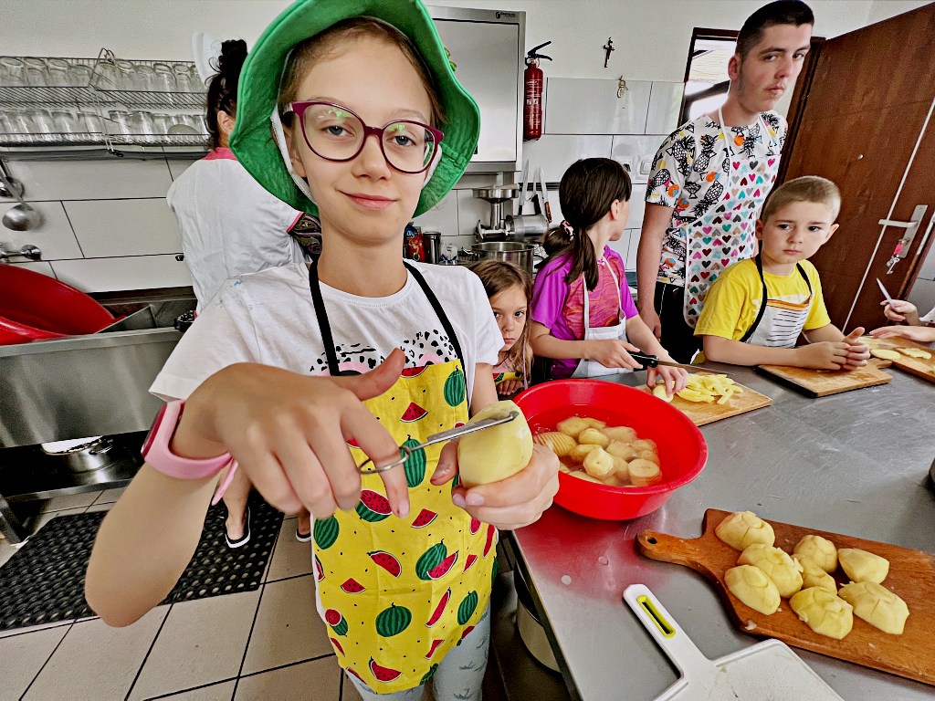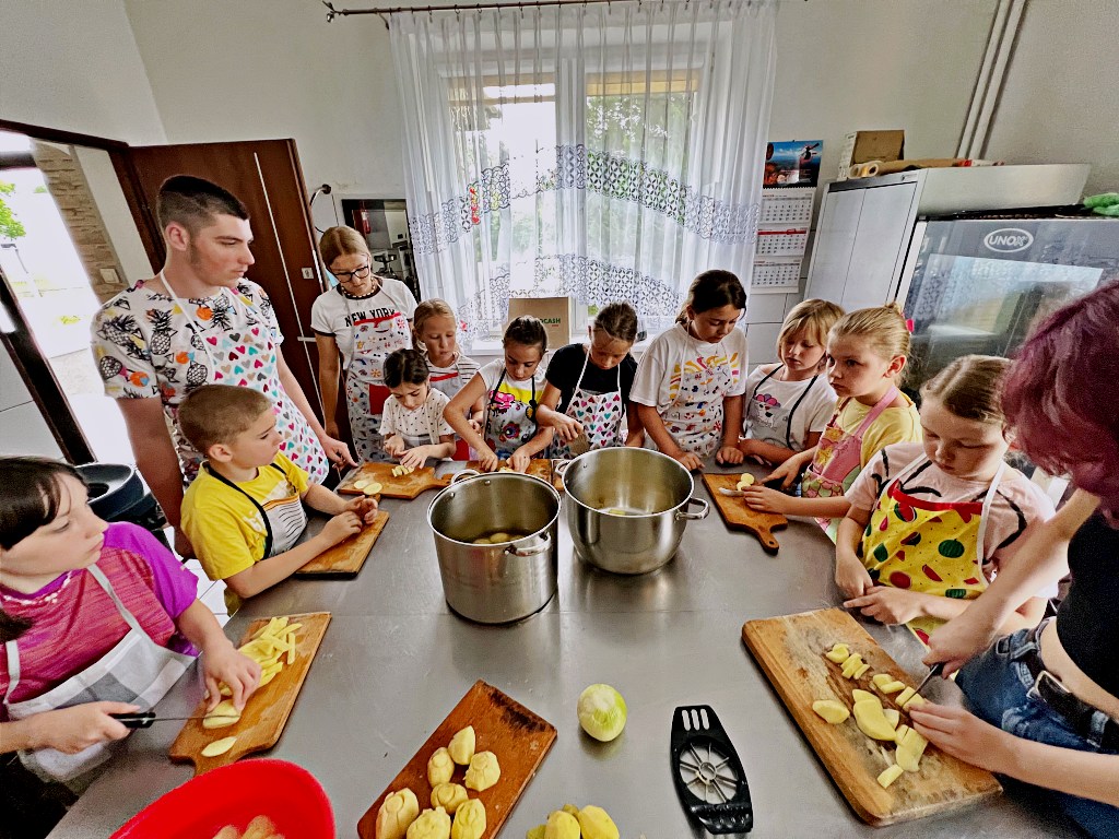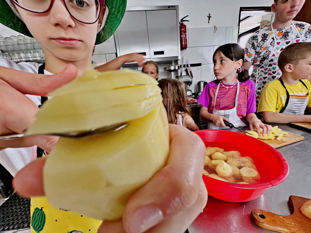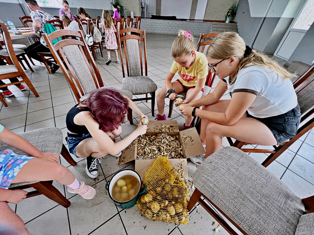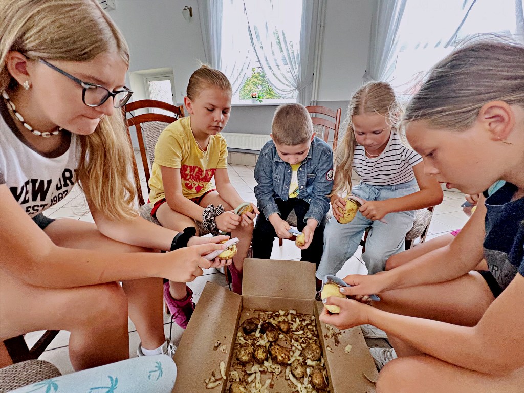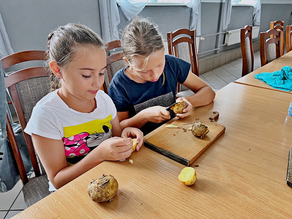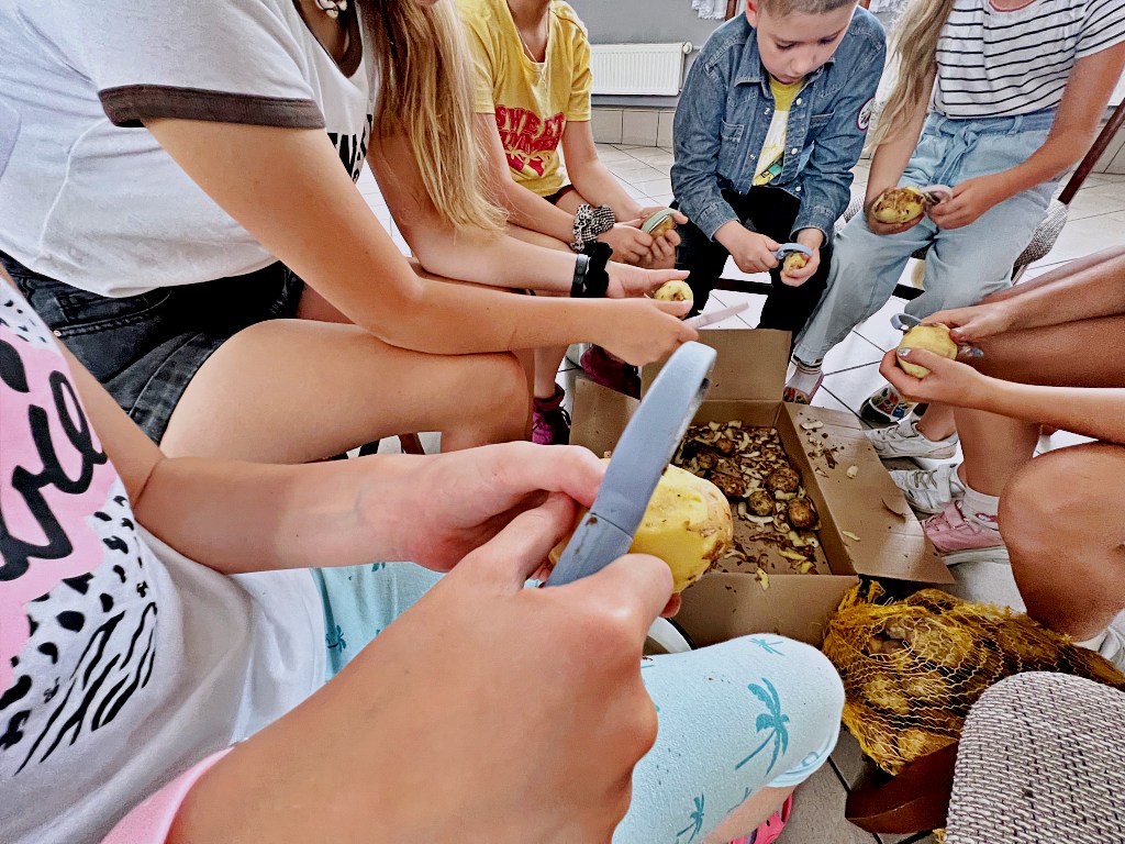 Na zajęciach wakacyjnych w CEE zaczęliśmy od obierania ziemniaków. Następnie przeszliśmy do kuchni udostępnionej przez KGW z WIeprza Panią Janinę Kłusak, gdzie odbyły się warsztaty kulinarne. Każdy mógł wziąć udział w przygotowywaniu różnych potraw z ziemniaka. W menu znalazły się frytki, placki ziemniaczane i wiele innych smakowitych przysmaków. Dzięki wspólnemu gotowaniu zyskaliśmy nowe umiejętności kulinarne i okazję do podzielenia się swoimi ulubionymi przepisami z ziemniakami.