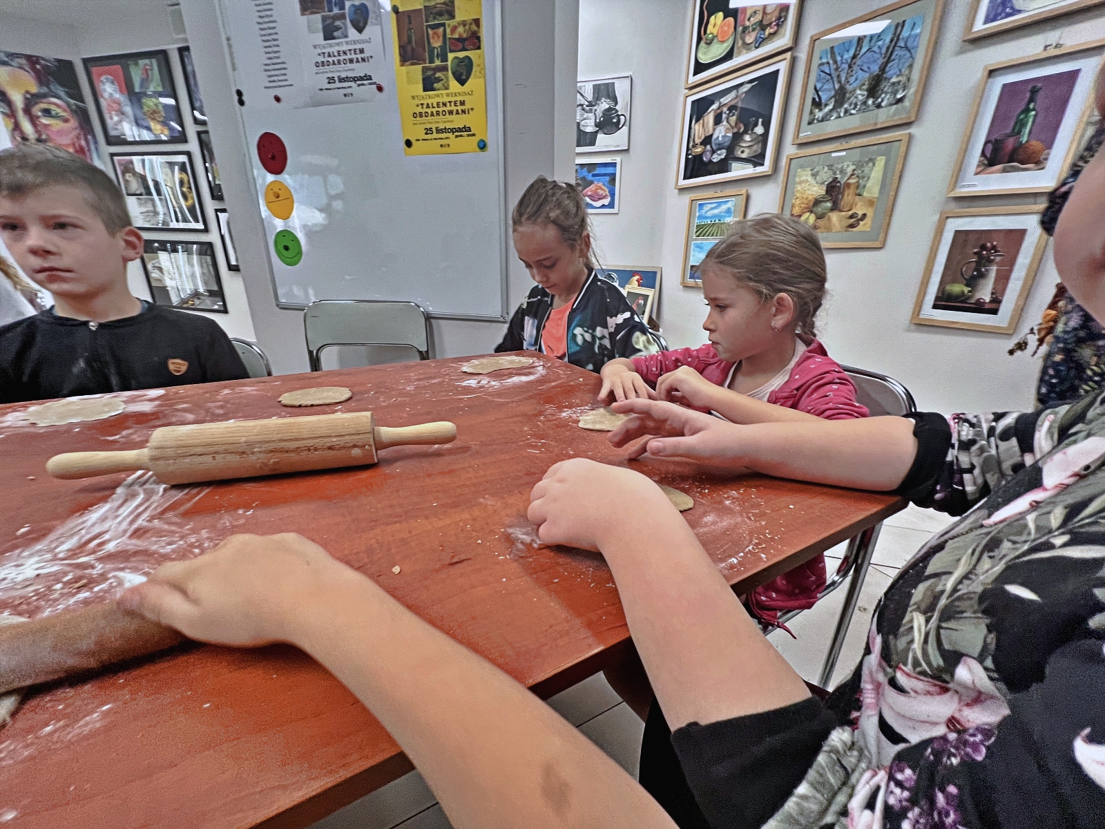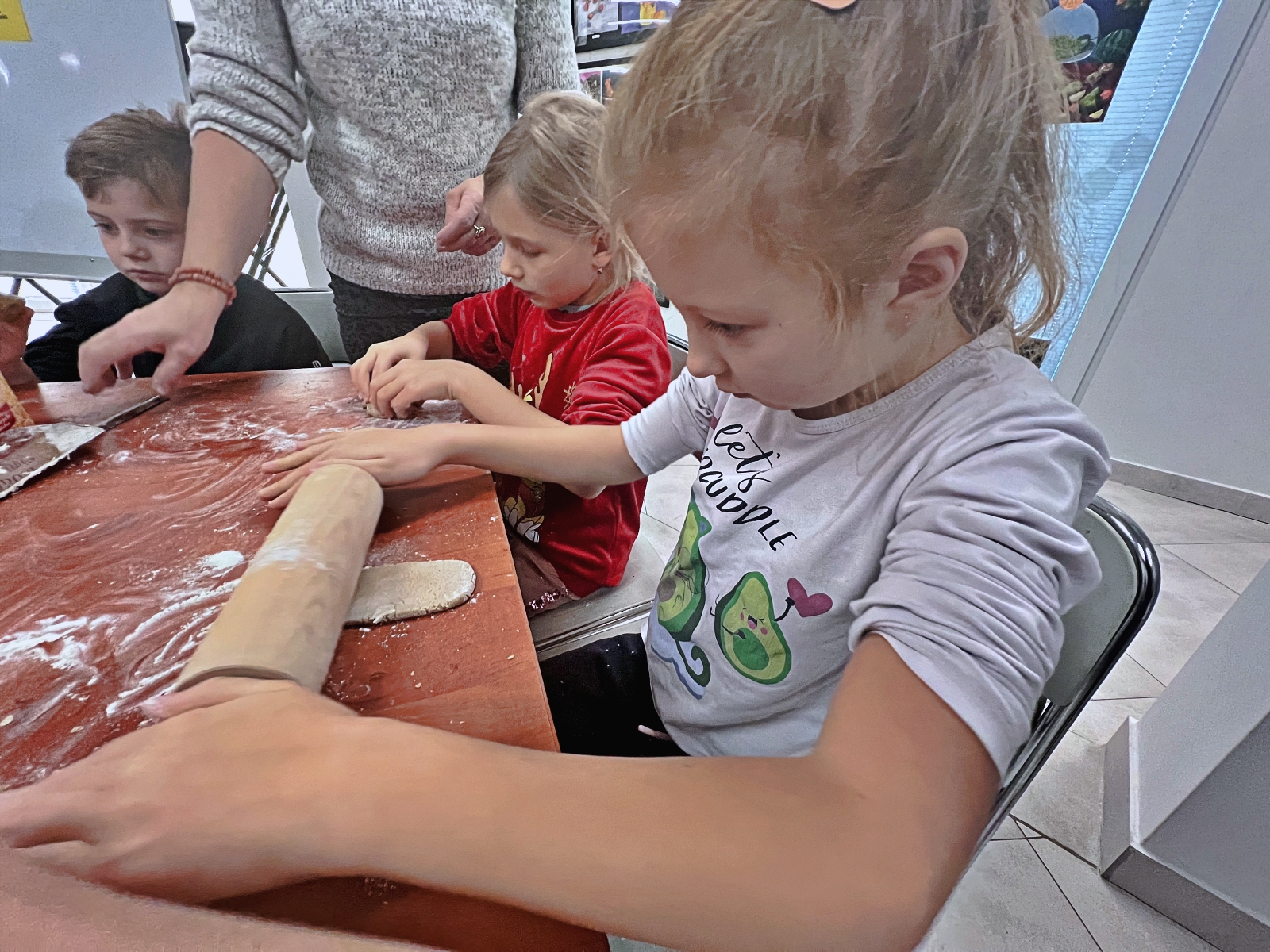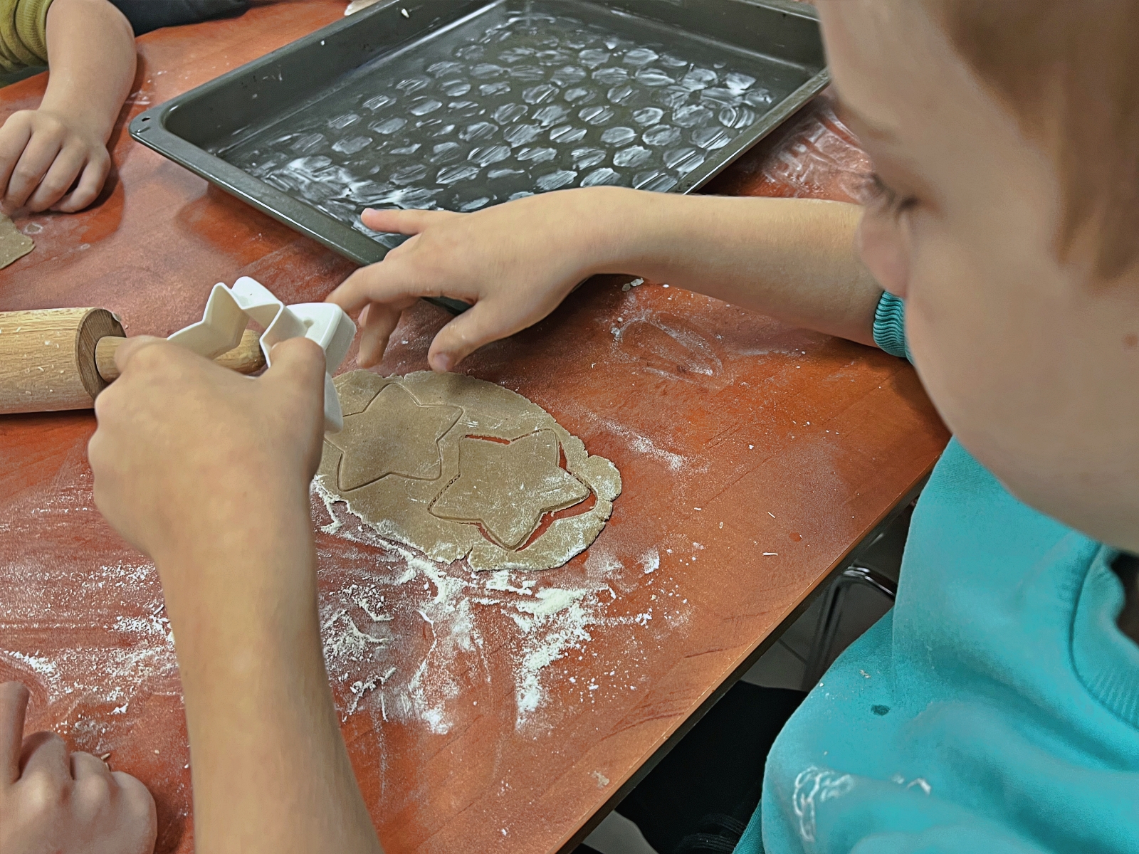 Kolejnym punktem programu były cukiernicze przygody, podczas których z radością wyrabialiśmy ciasto na pierniki. Każde dziecko miało szansę wykroić swoje własne gwiazdki, które później posłużyły do stworzenia wyjątkowego wieńca świątecznego. Zabawa była pełna śmiechu i radości, a aromatyczne ciasto sprawiło, że Centrum napełniło się cudownym zapachem świąt.