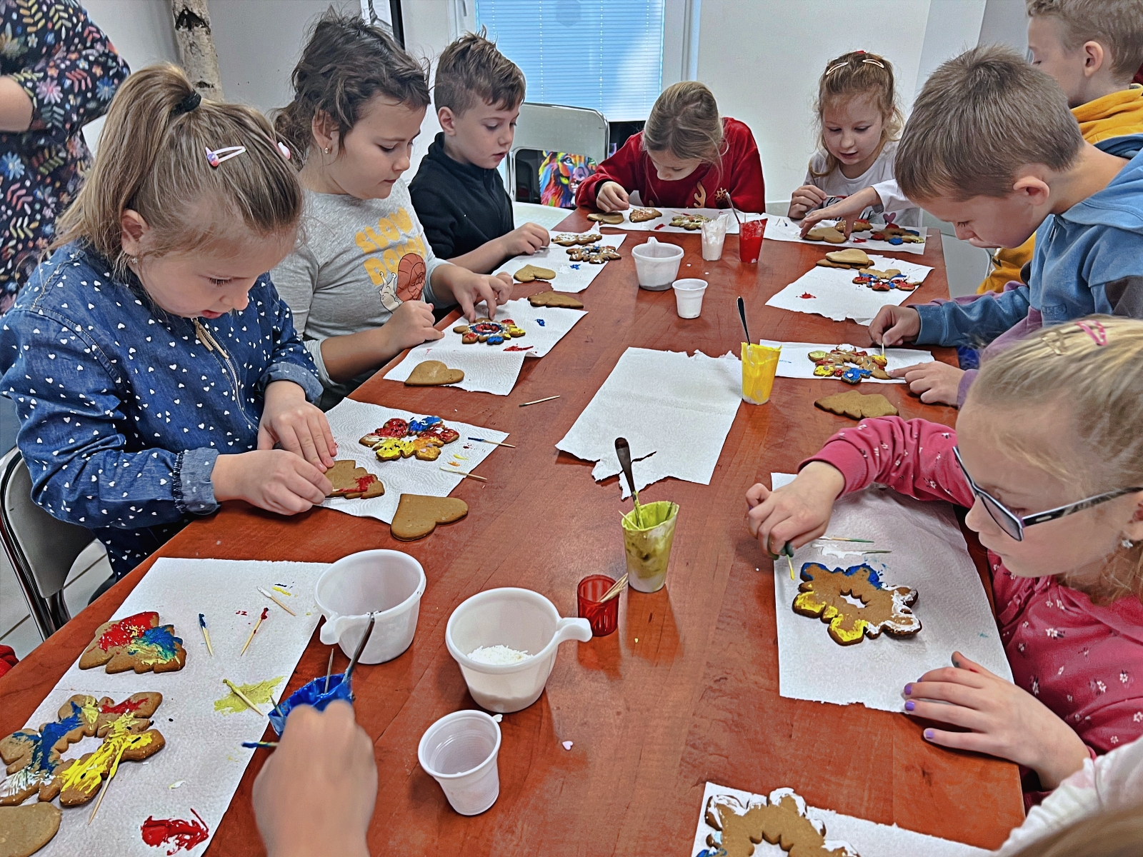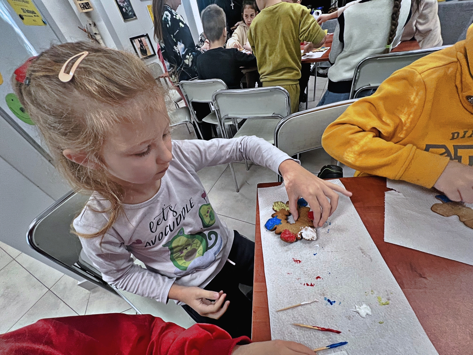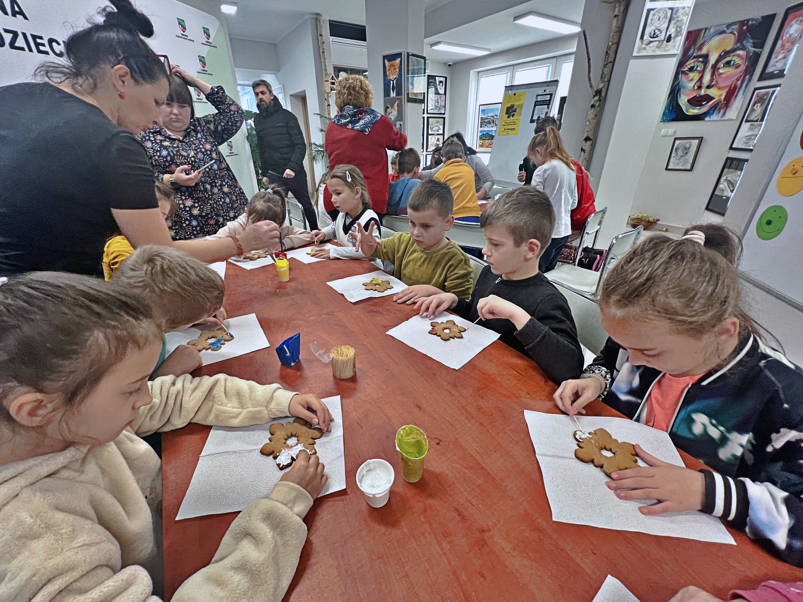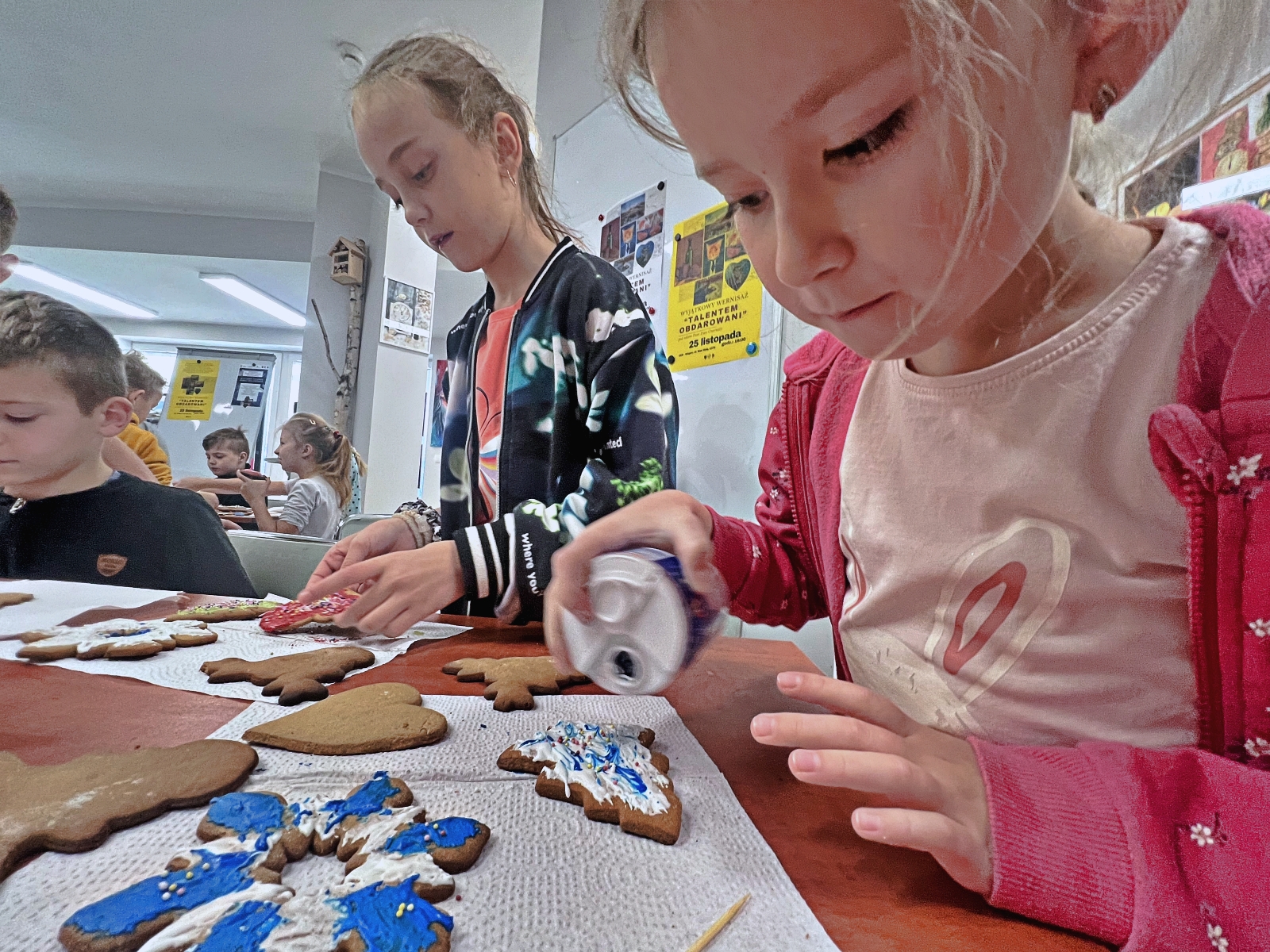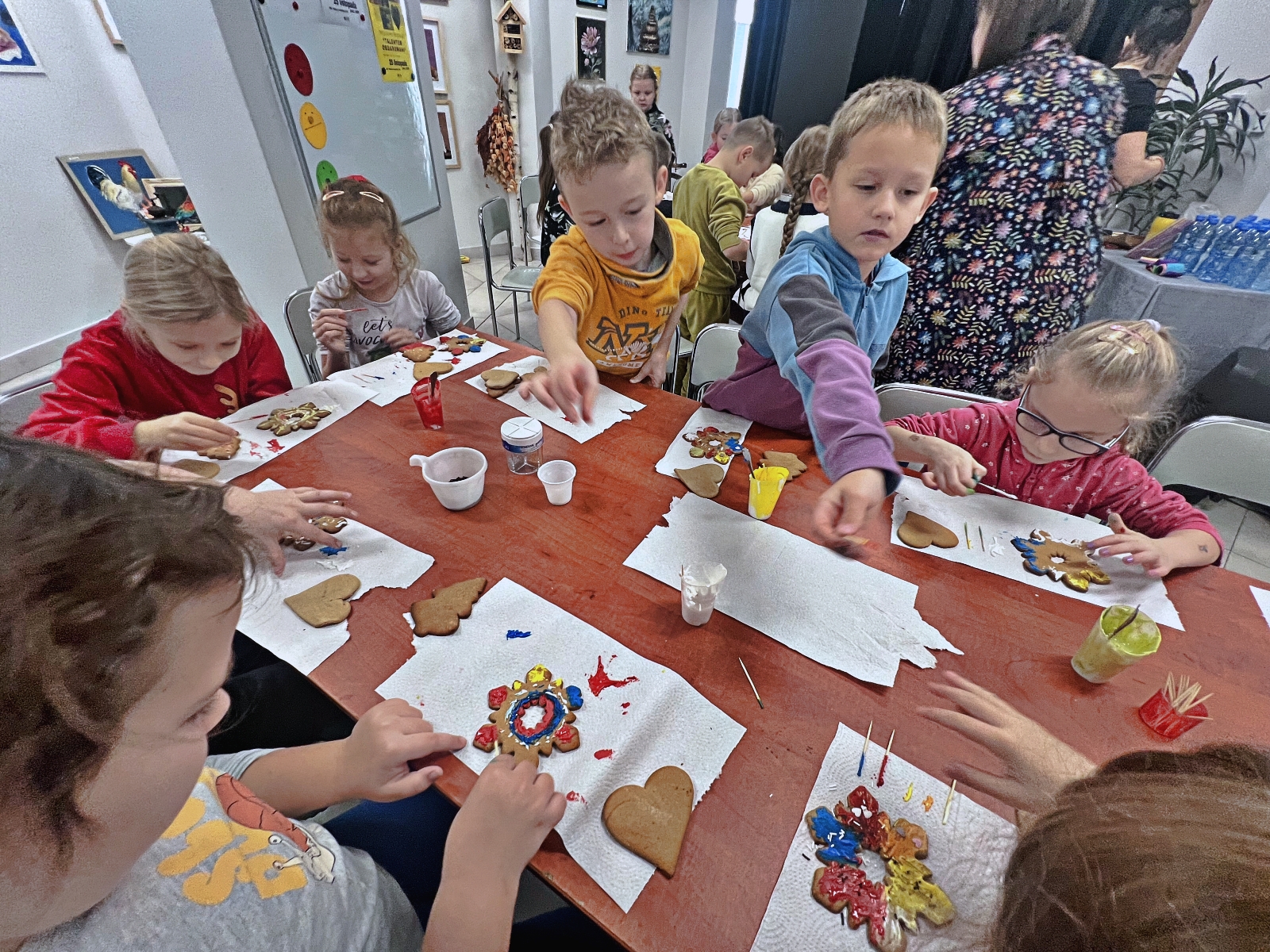 Następnie nadszedł czas na magiczną sztukę ozdabiania pierniczków. Gwiazdy, choinki, renifery i serca ożywały pod dziecięcymi paluszkami, a różnorodne słodkie koraliki i ozdoby dodawały im wyjątkowego blasku. To było prawdziwe świąteczne rękodzieło, które dzieci wykonały z entuzjazmem i pasją.
