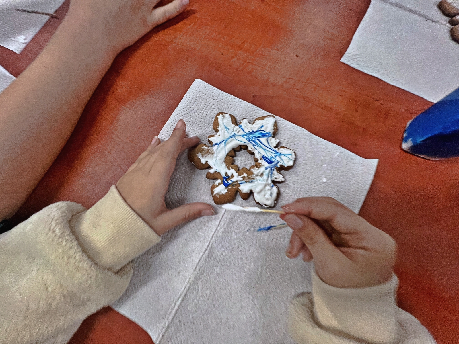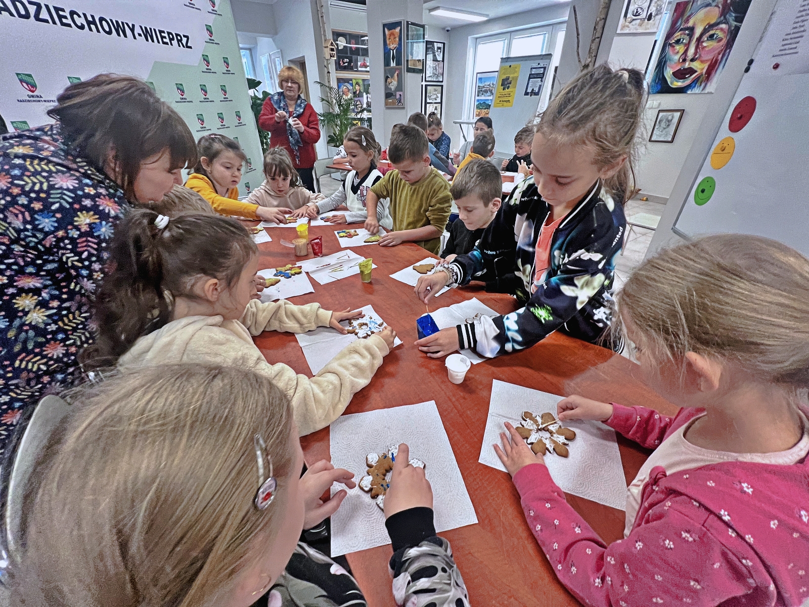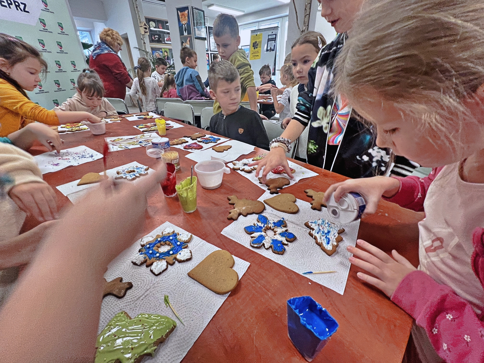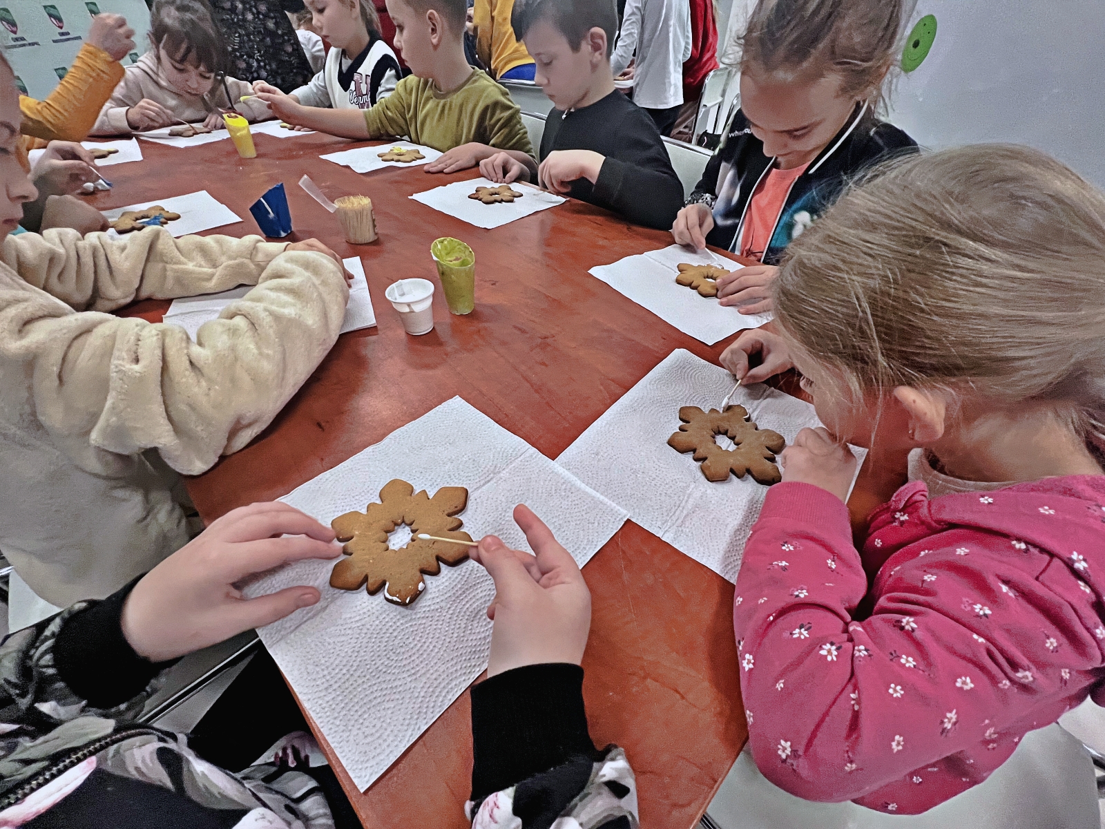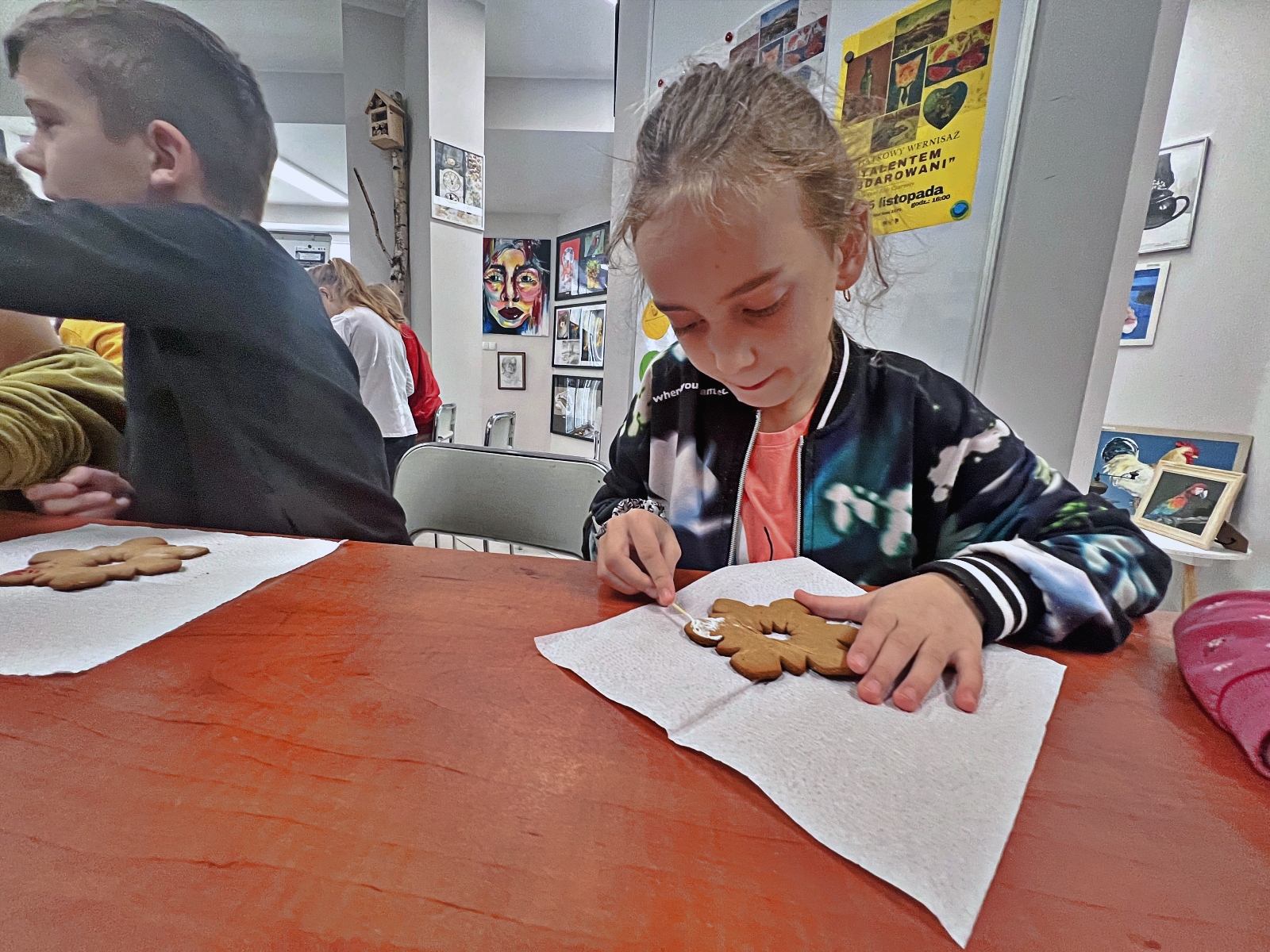 Następnie nadszedł czas na magiczną sztukę ozdabiania pierniczków. Gwiazdy, choinki, renifery i serca ożywały pod dziecięcymi paluszkami, a różnorodne słodkie koraliki i ozdoby dodawały im wyjątkowego blasku. To było prawdziwe świąteczne rękodzieło, które dzieci wykonały z entuzjazmem i pasją.