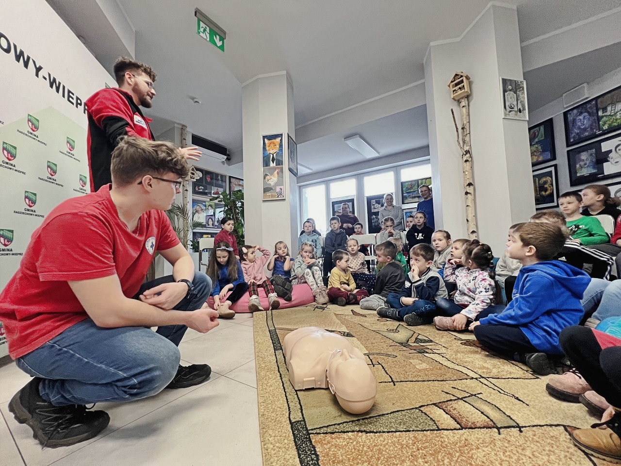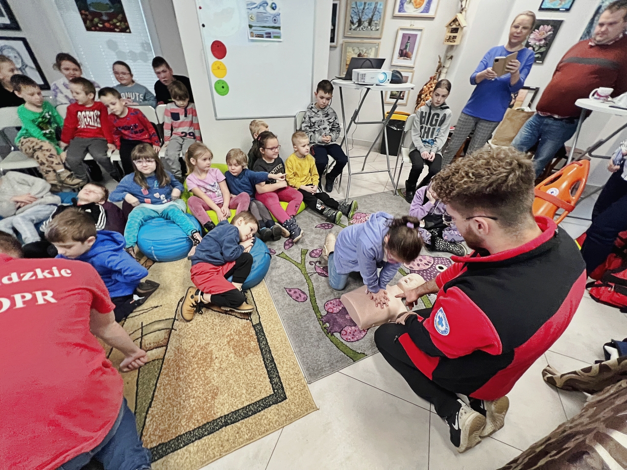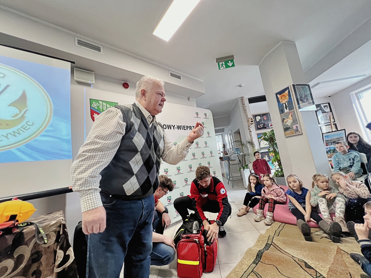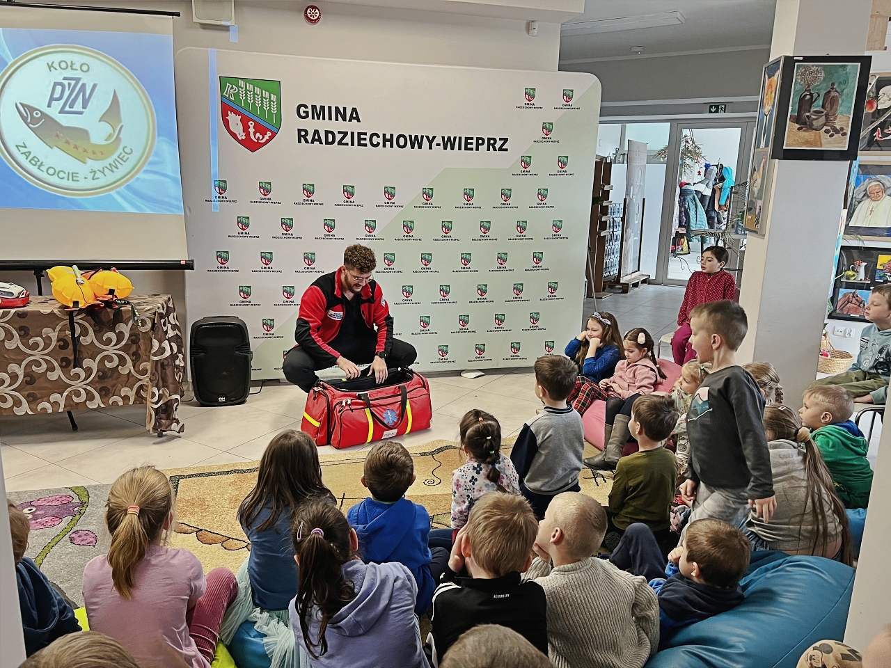 Przed prelekcją Pana Bogusława Juźwy, uczestnicy warsztatów mieli okazję zapoznać się z działalnością Beskidzkiego Wodnego Ochotniczego Pogotowia Ratunkowego. Panowie z tego zespołu przedstawili sprzęt ratunkowy, którym dysponują, oraz omówili zasady działania w sytuacjach awaryjnych nad wodą. Dzieci mogły z bliska obejrzeć specjalistyczny sprzęt, a także wziąć udział w pokazach udzielania pierwszej pomocy.