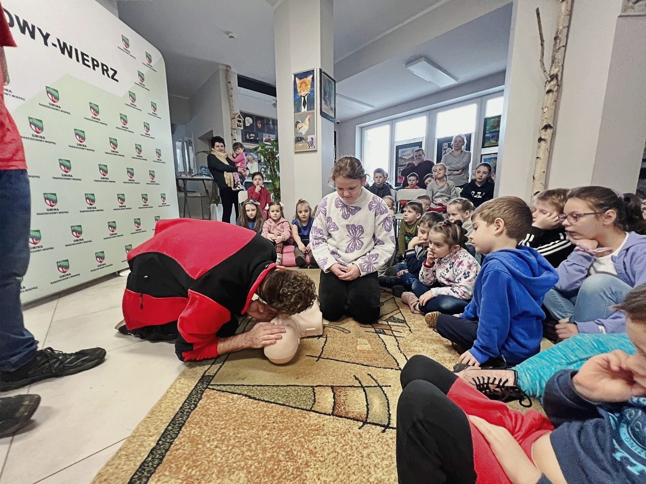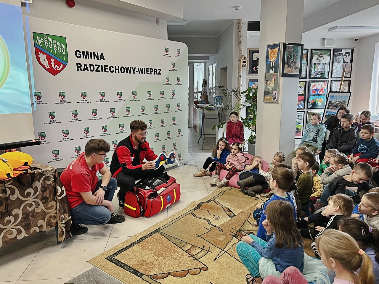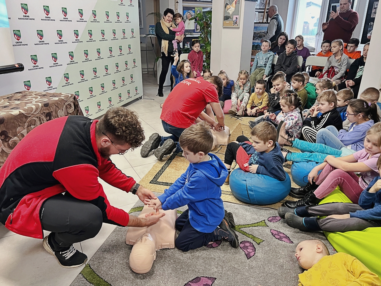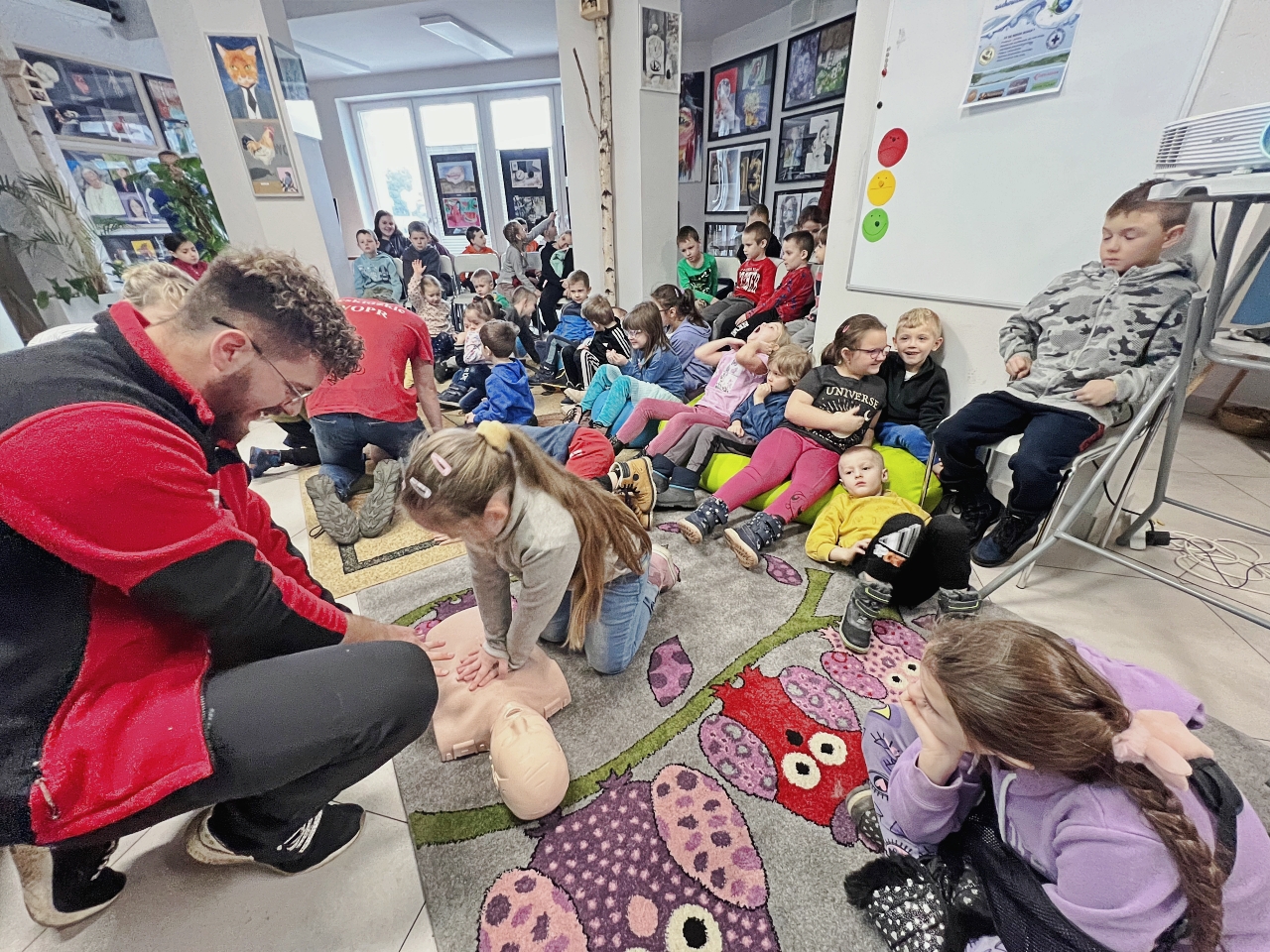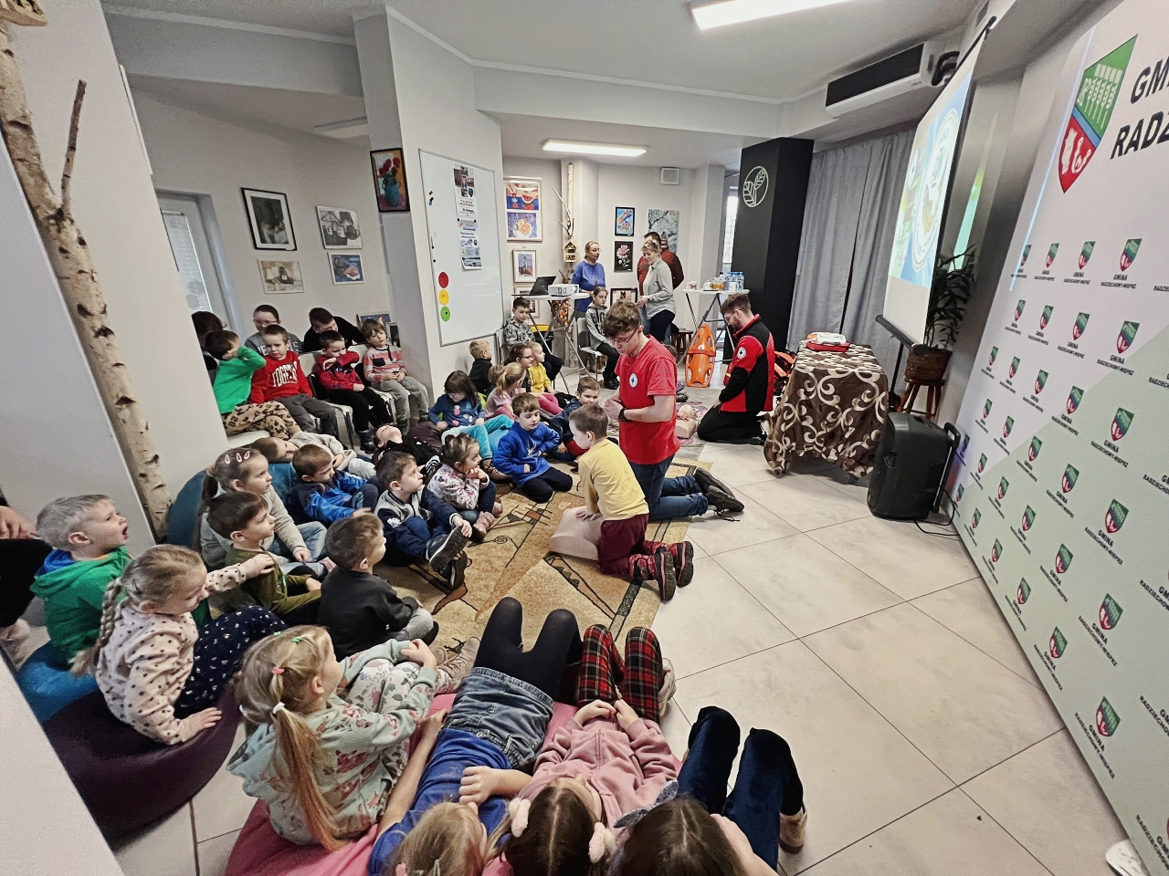 Przed prelekcją Pana Bogusława Juźwy, uczestnicy warsztatów mieli okazję zapoznać się z działalnością Beskidzkiego Wodnego Ochotniczego Pogotowia Ratunkowego. Panowie z tego zespołu przedstawili sprzęt ratunkowy, którym dysponują, oraz omówili zasady działania w sytuacjach awaryjnych nad wodą. Dzieci mogły z bliska obejrzeć specjalistyczny sprzęt, a także wziąć udział w pokazach udzielania pierwszej pomocy.