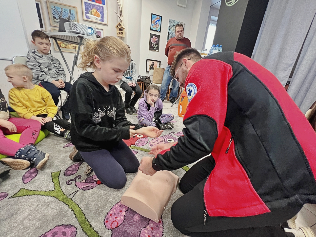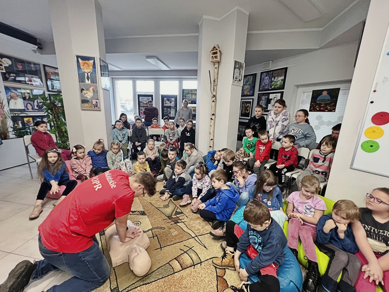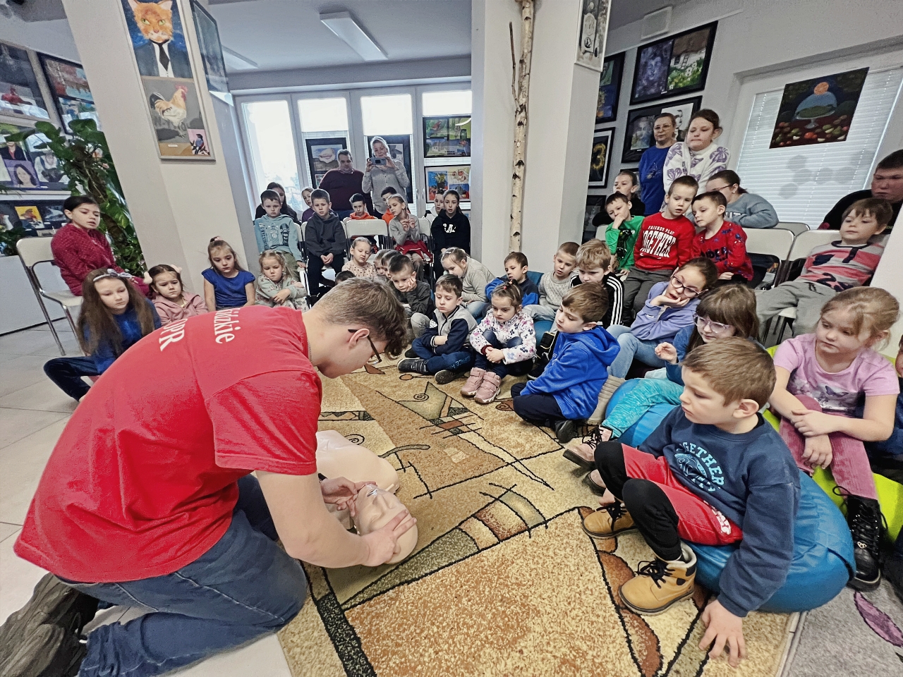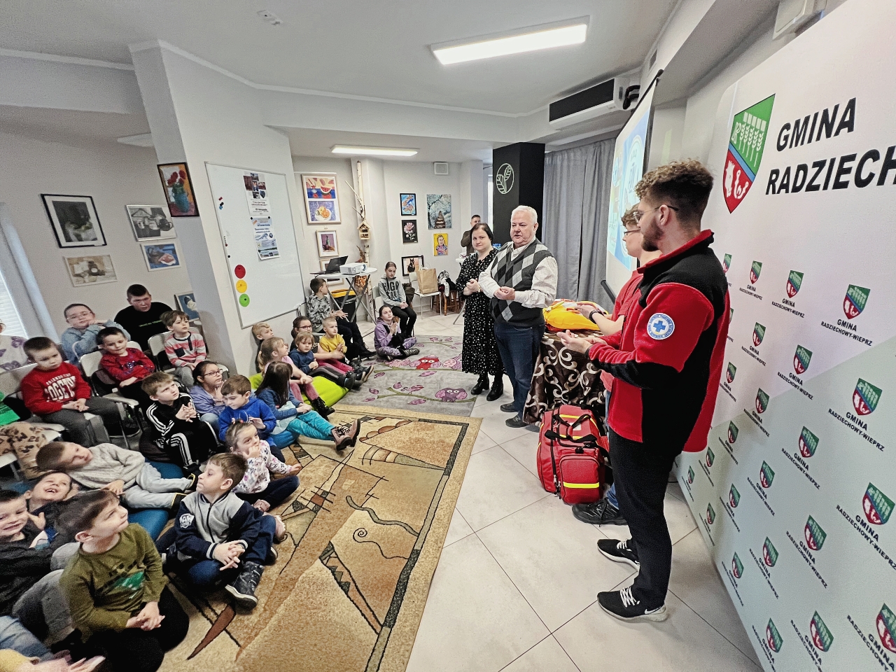 Przed prelekcją Pana Bogusława Juźwy, uczestnicy warsztatów mieli okazję zapoznać się z działalnością Beskidzkiego Wodnego Ochotniczego Pogotowia Ratunkowego. Panowie z tego zespołu przedstawili sprzęt ratunkowy, którym dysponują, oraz omówili zasady działania w sytuacjach awaryjnych nad wodą. Dzieci mogły z bliska obejrzeć specjalistyczny sprzęt, a także wziąć udział w pokazach udzielania pierwszej pomocy.