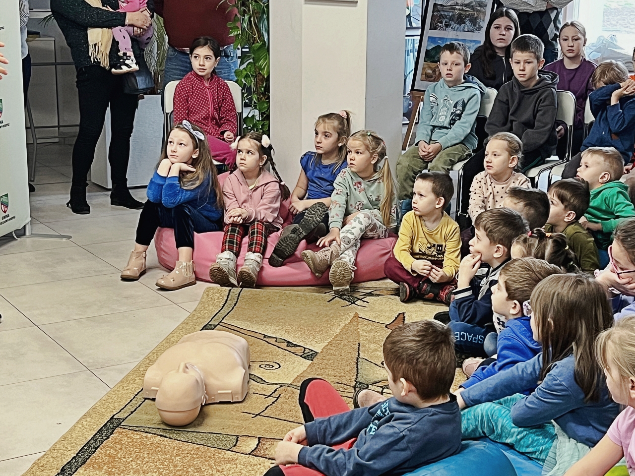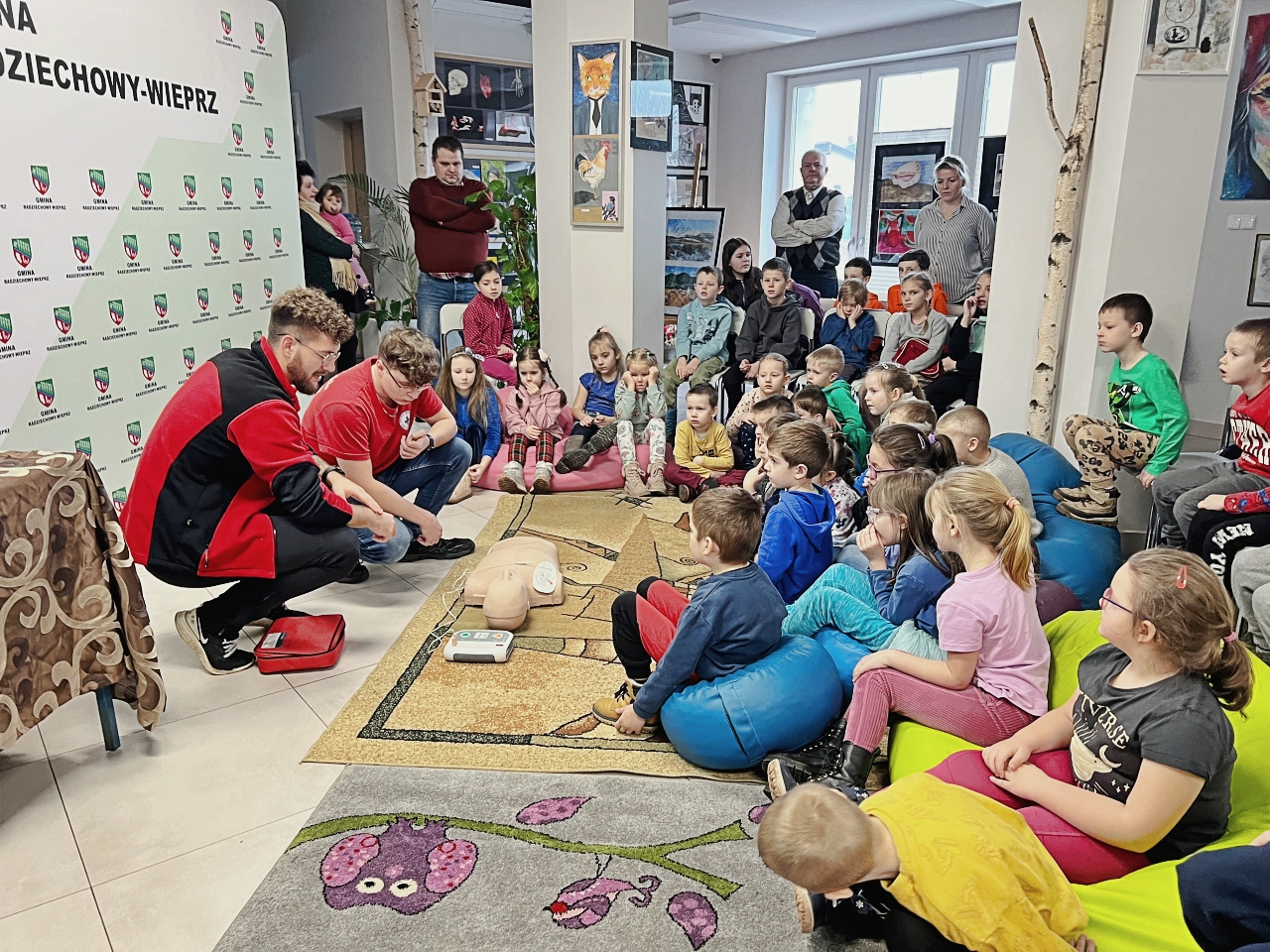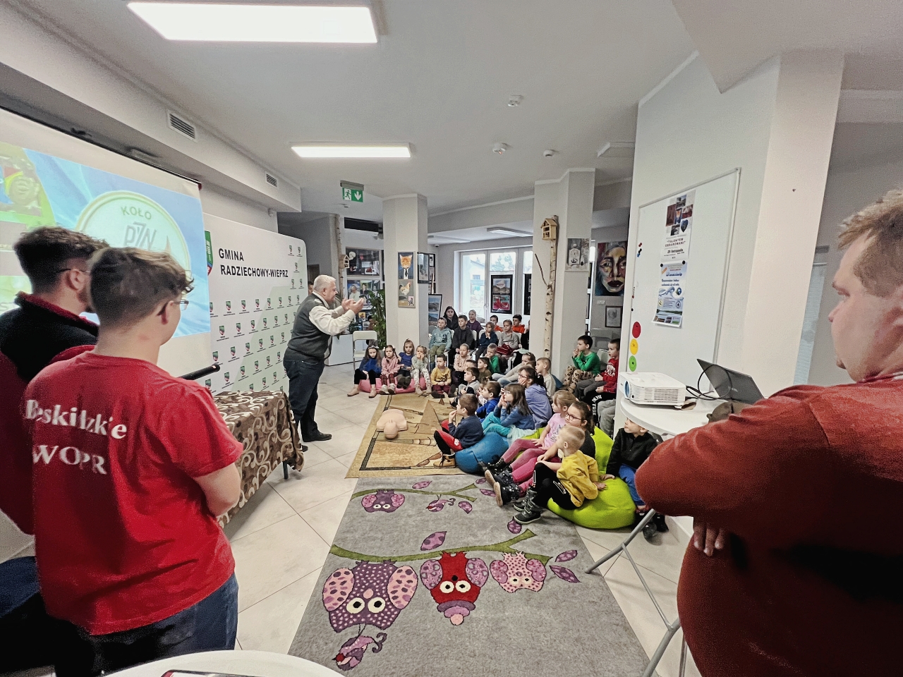 Przed prelekcją Pana Bogusława Juźwy, uczestnicy warsztatów mieli okazję zapoznać się z działalnością Beskidzkiego Wodnego Ochotniczego Pogotowia Ratunkowego. Panowie z tego zespołu przedstawili sprzęt ratunkowy, którym dysponują, oraz omówili zasady działania w sytuacjach awaryjnych nad wodą. Dzieci mogły z bliska obejrzeć specjalistyczny sprzęt, a także wziąć udział w pokazach udzielania pierwszej pomocy.