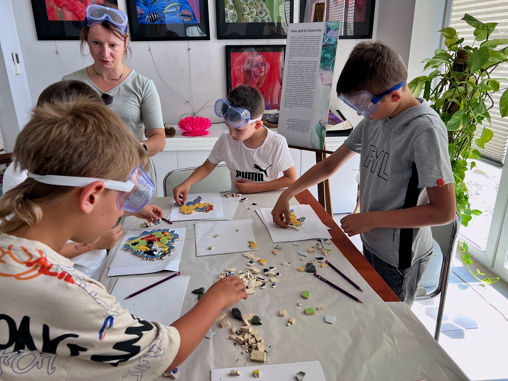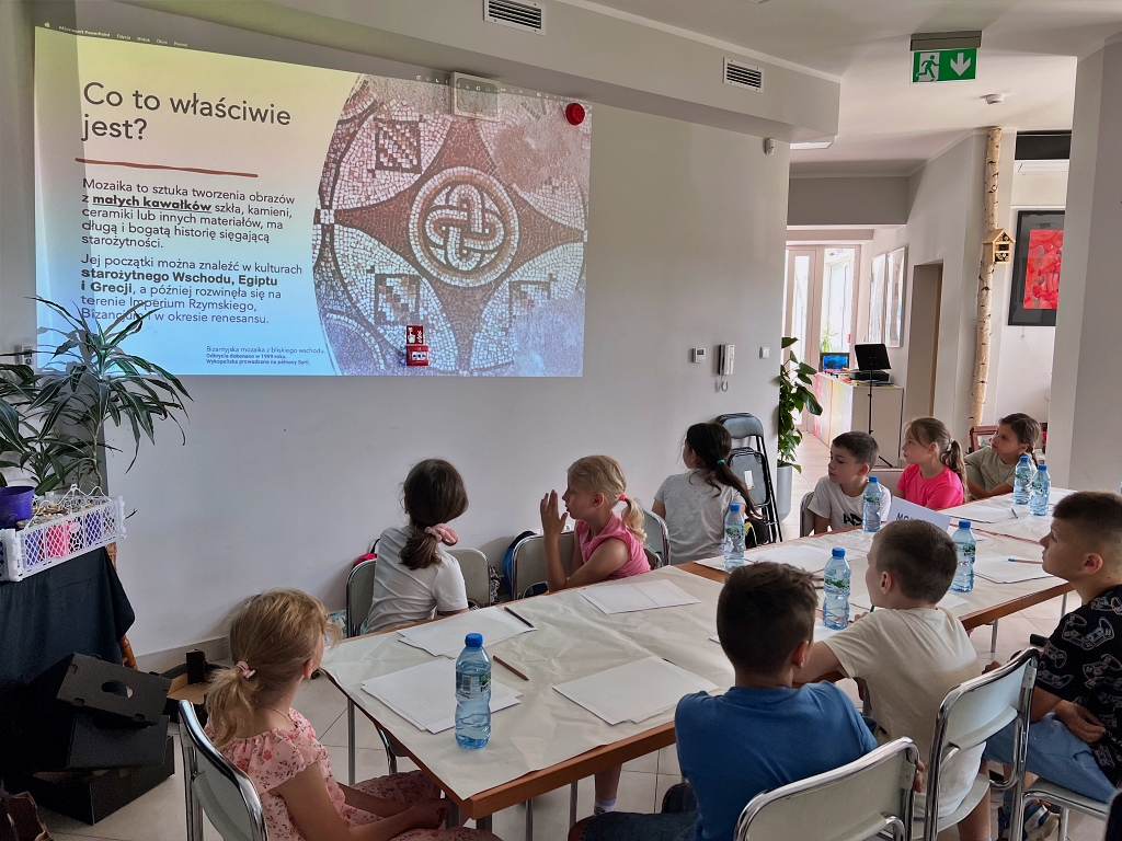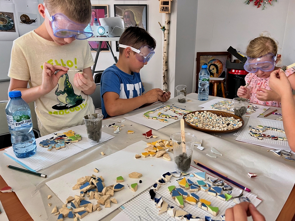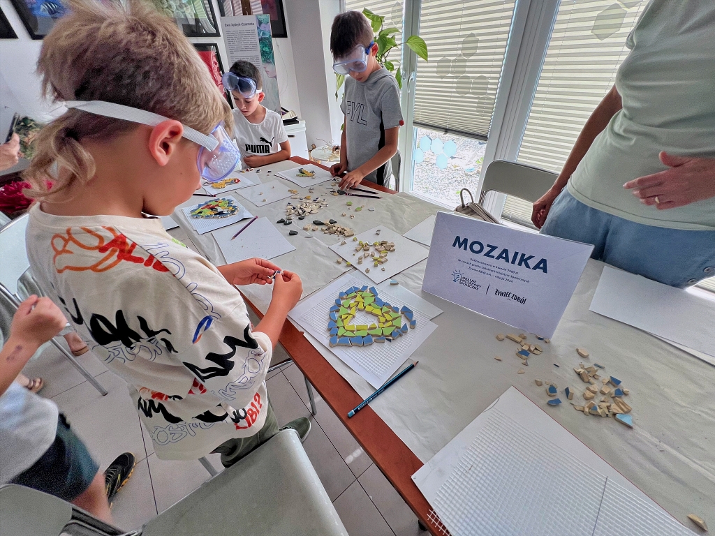 Podczas tych twórczych warsztatów, dzieci miały okazję poznać fascynującą historię mozaiki, sięgającą starożytności. Uczniowie tworzyli piękne wzory z kawałków płytek, które zostały ofiarowane przez mieszkańców Gminy Radziechowy-Wieprz.
