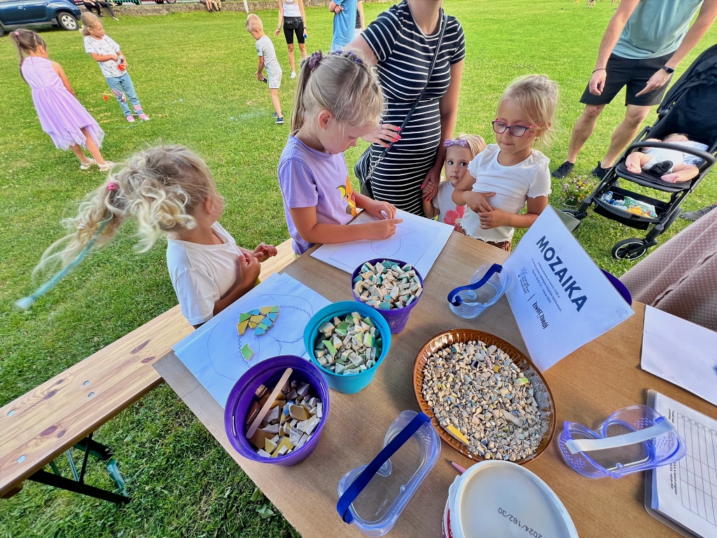 Warsztaty MOZAIKI były nie tylko okazją do twórczej pracy, ale również do wspólnej zabawy i integracji. Atmosfera podczas zajęć była pełna radości i pozytywnej energii, co dodatkowo motywowało uczestników do działania. Wszyscy, zarówno dzieci, jak i dorośli, z uśmiechem na twarzy uczestniczyli w zajęciach, tworząc piękne mozaiki, które będą wspaniałą pamiątką tego wydarzenia.