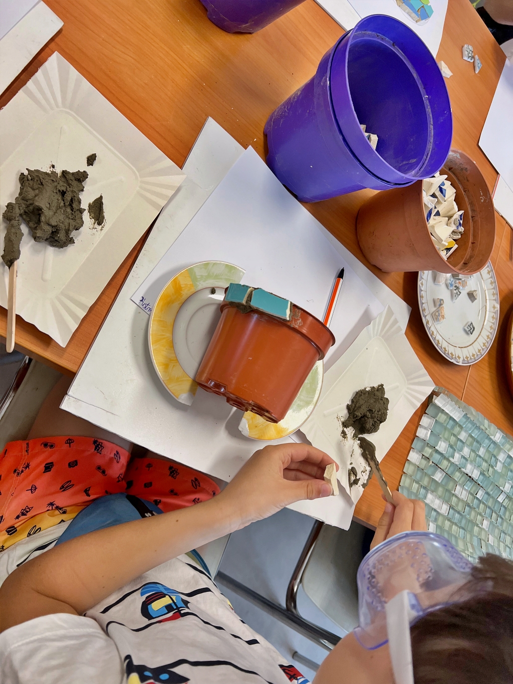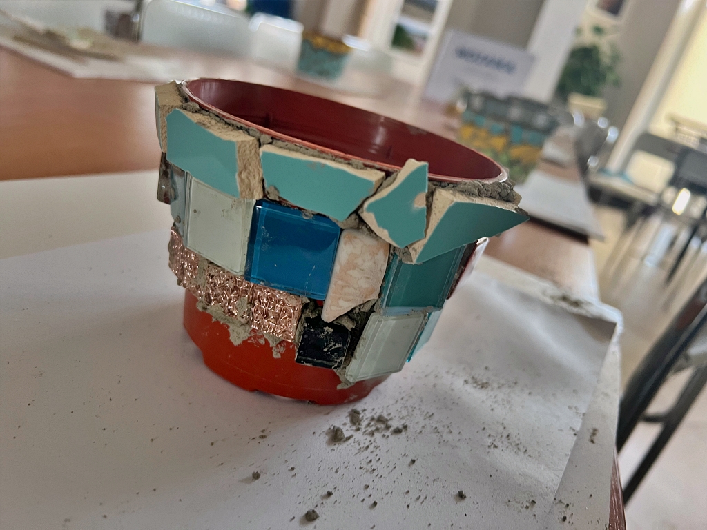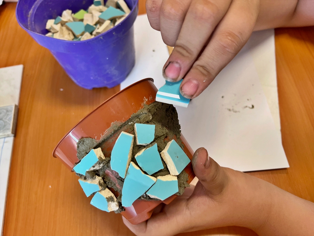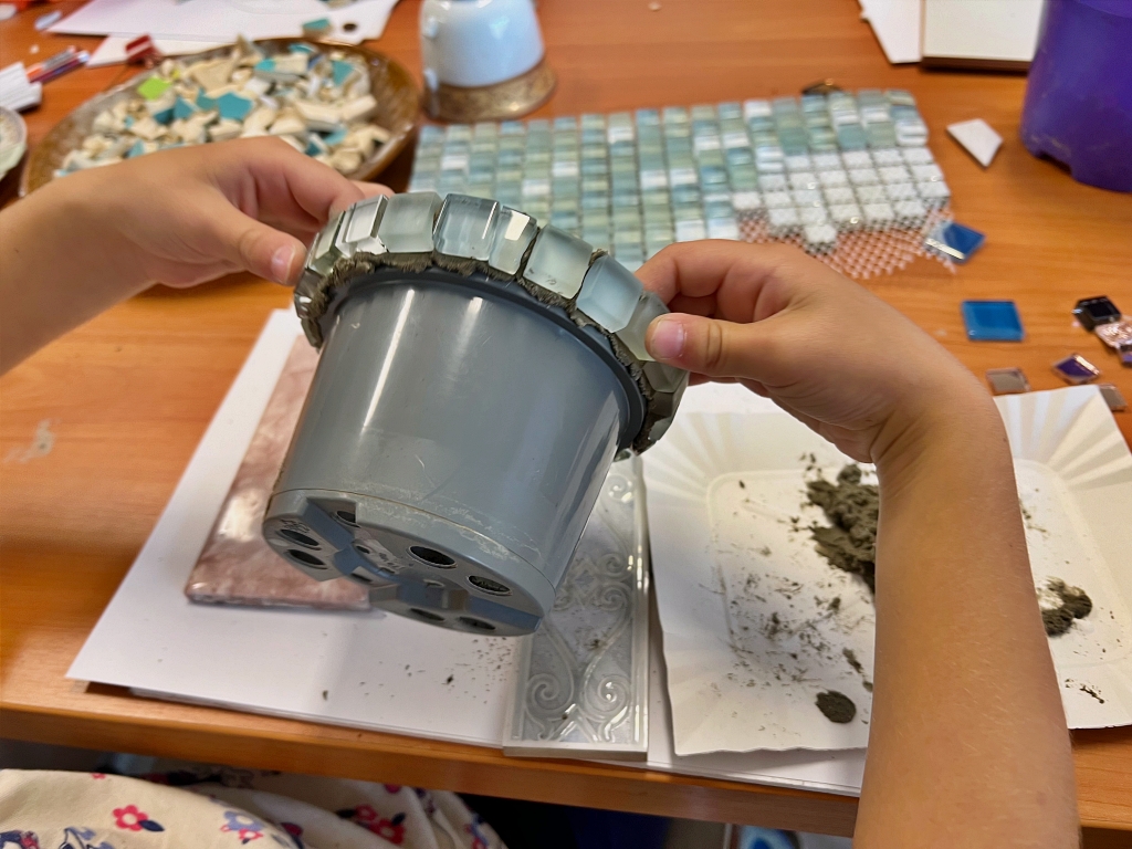 Dzieci na warsztaty przyniosły z domu różnorodne płytki, które stały się podstawą naszych twórczych działań. Każdy uczestnik mógł wykorzystać przyniesione materiały, co nadało każdej donicy unikalny i osobisty charakter. Dzięki temu prace były nie tylko piękne, ale także pełne emocji i wspomnień.