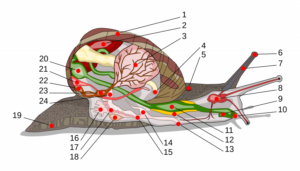 1. muszla, 2. wątrobotrzustka, 3. płuco w jamie płucnej, 4. odbyt, 5. otwór płucny, 6. oko, 7. czułek, 8. zwój mózgowy, 9. przewód ślinowy, 10. otwór gębowy z tarką, 11. wole (cz. przełyku), 12. gruczoł ślinowy, 13. otwór płciowy, 14. penis, 15. pochwa, 16. gruczoł śluzowy, 17. jajowód, 18. wapienna strzałka miłosna, 19. noga, 20. żołądek, 21. nerka pochodzenia metanefrydialnego, 22. płaszcz, 23. serce ślimaka, 24. nasieniowód.