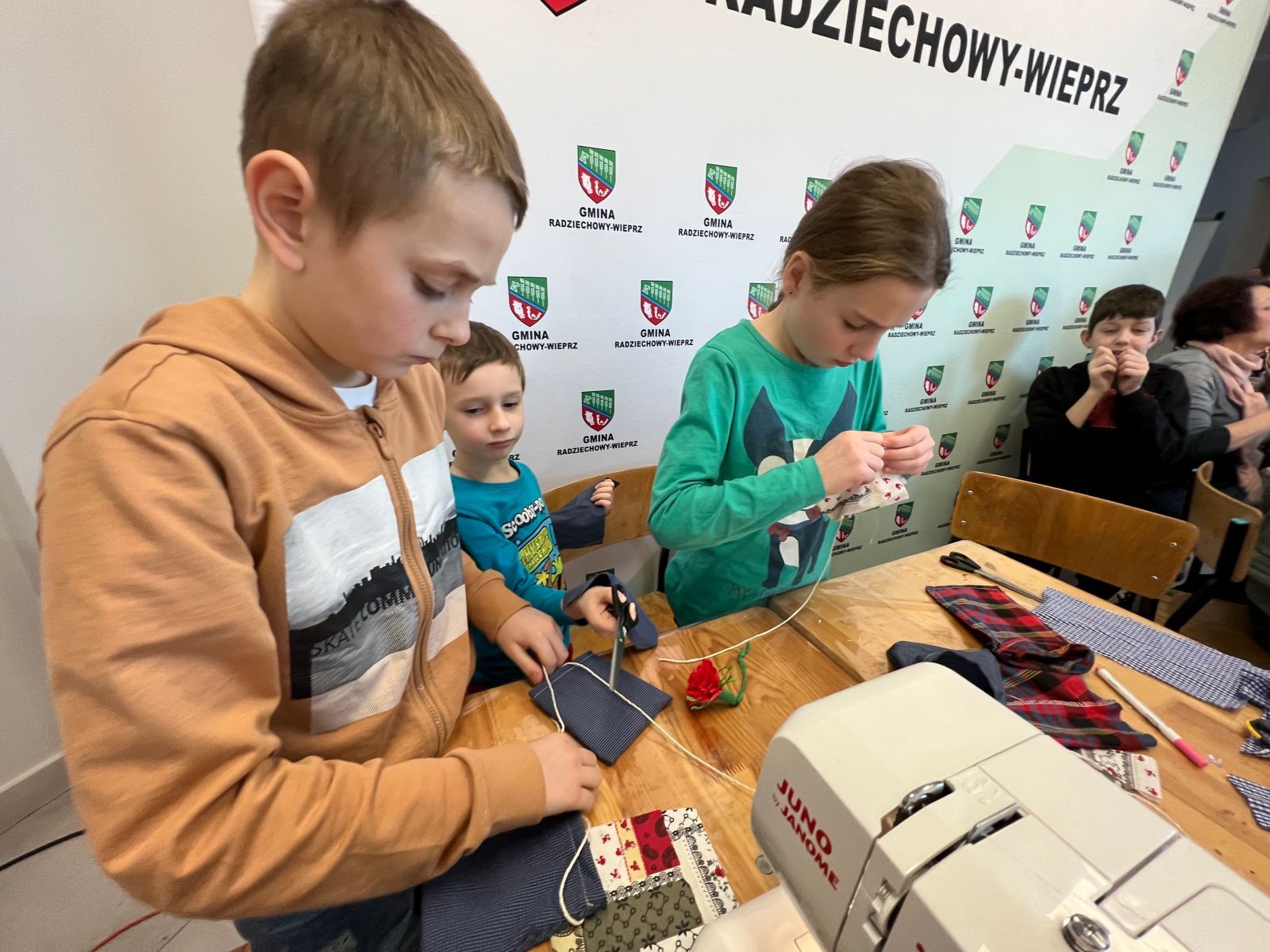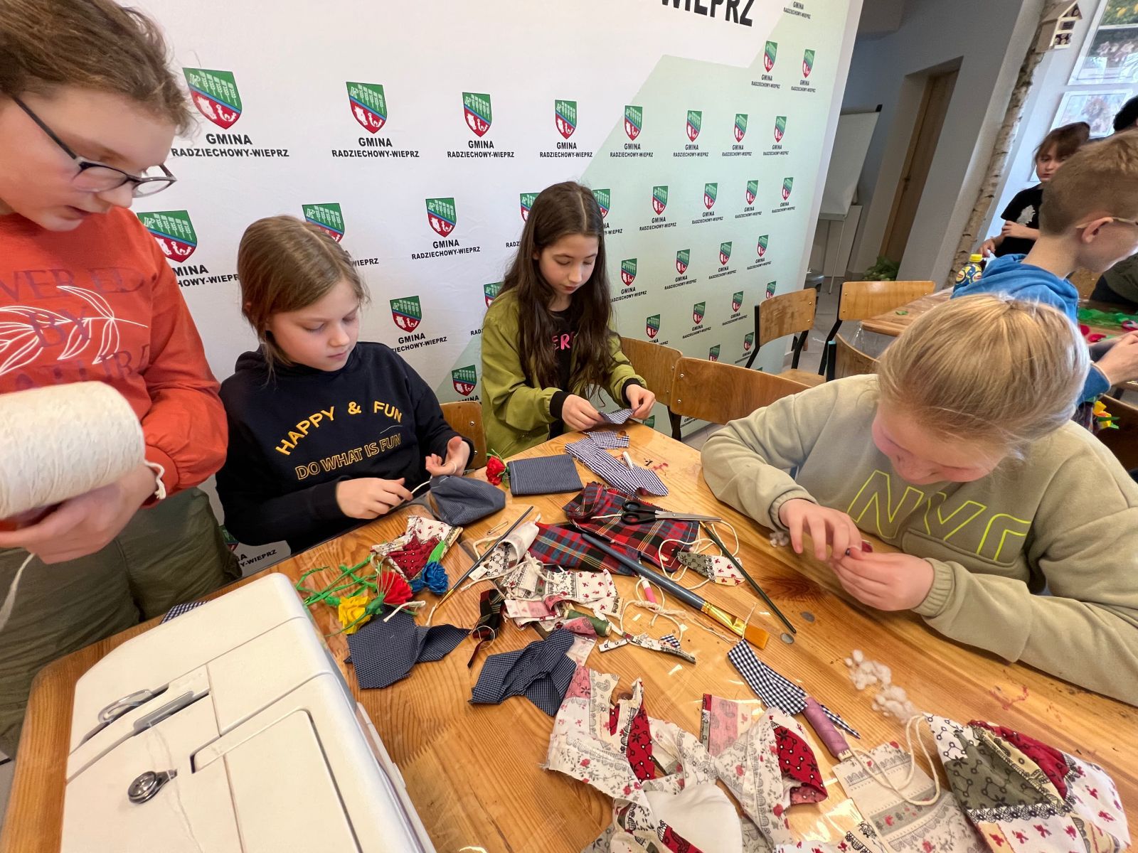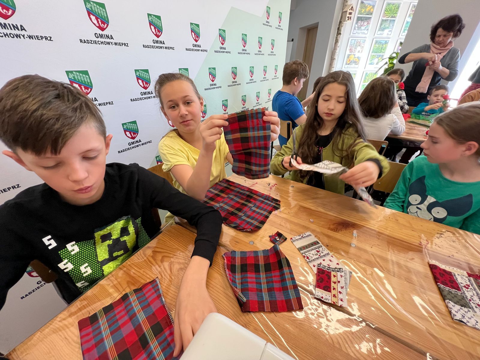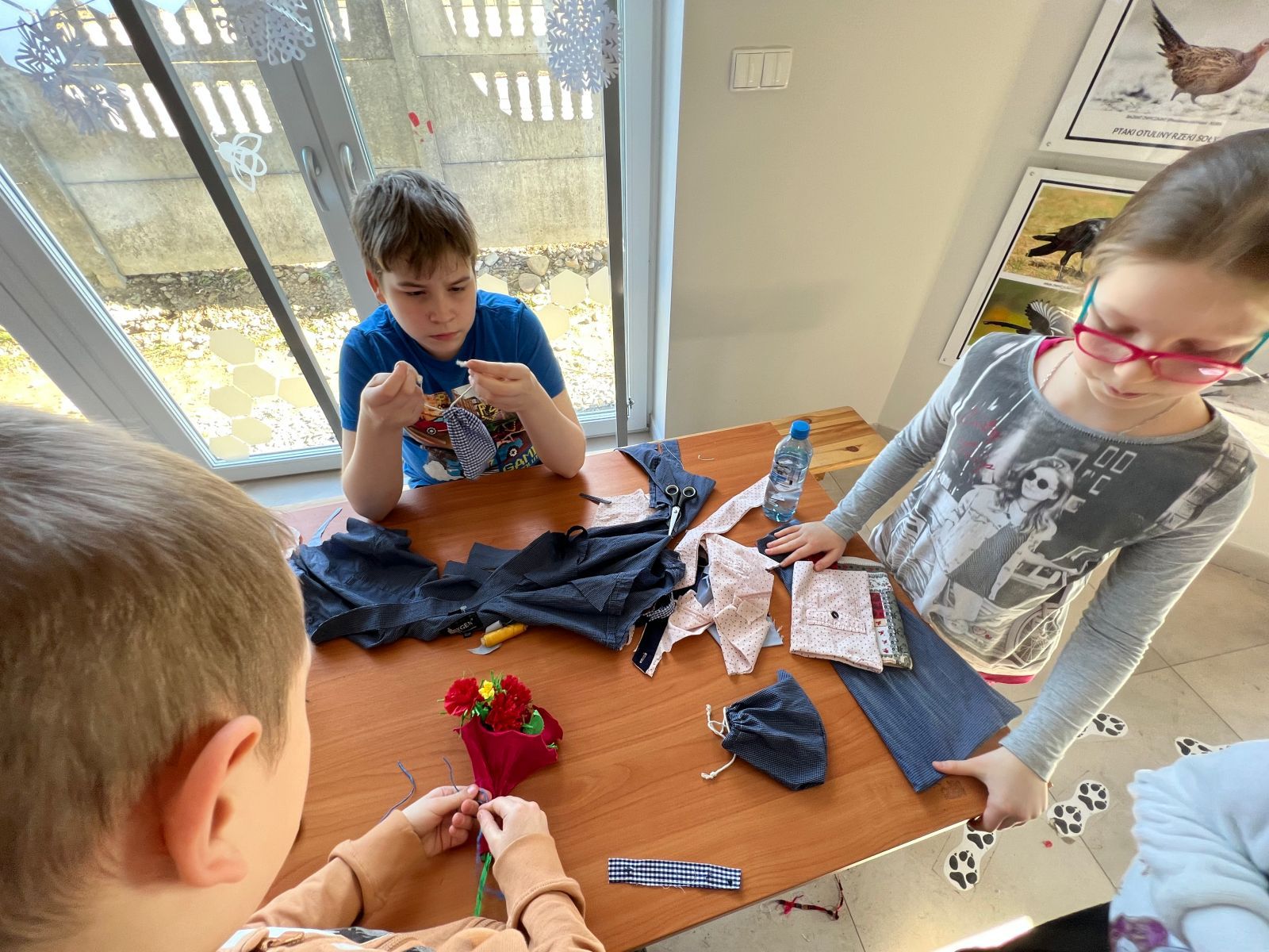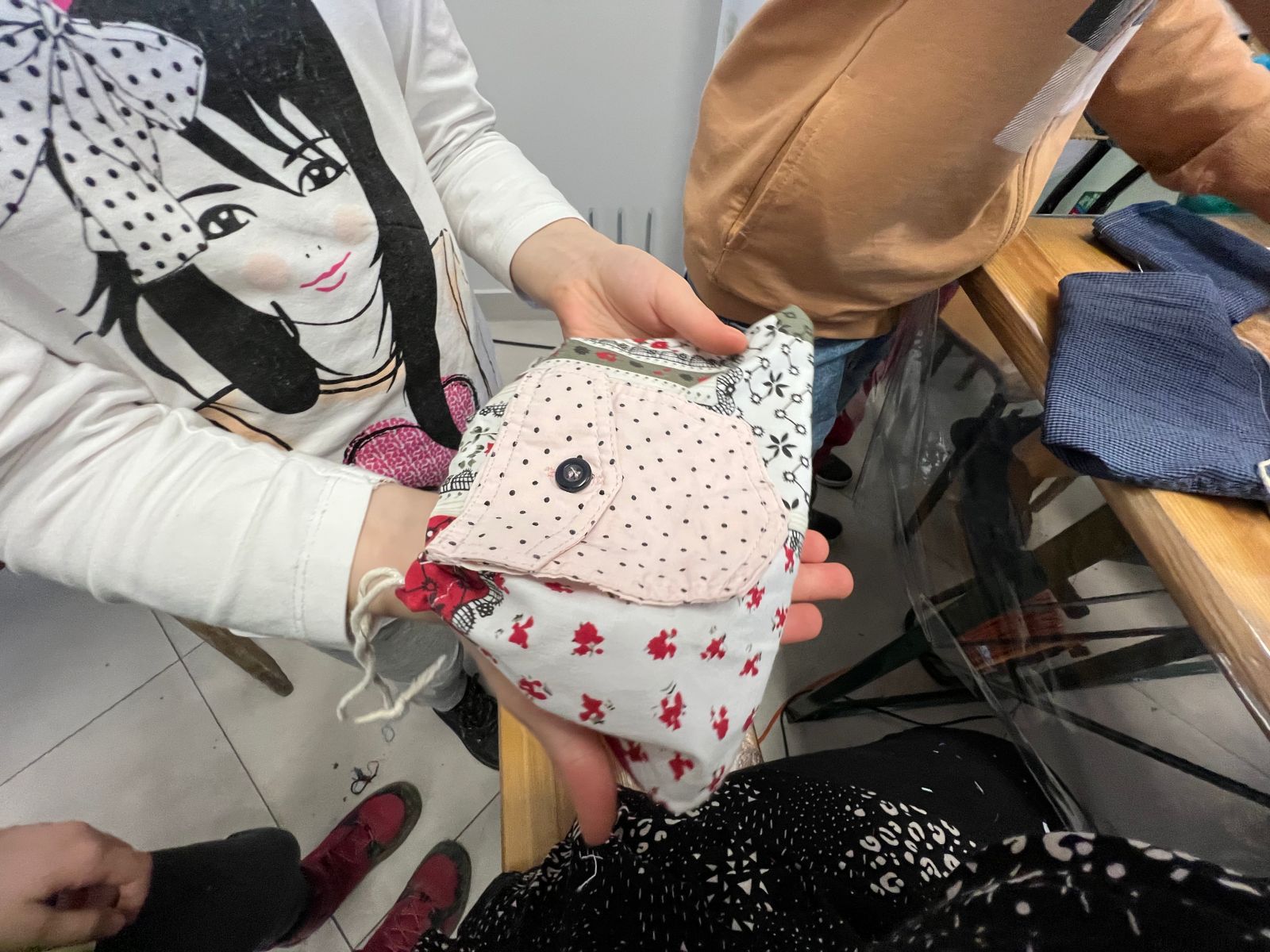 Prócz kwiatów z bibuły dzieci mogły uszyć woreczki na drobiazgi z różnych materiałów – jeansowe lub bawełniane. Kolory, wzory i kroje zachwycały a w szczególności pomysłowość dzieci. Materiały na worezki pochodziły z recyklingu a zajęcia miały na celu przedstawić dzieciom możliwości wykorzystania starych już niepotrzebnych ubrań.
