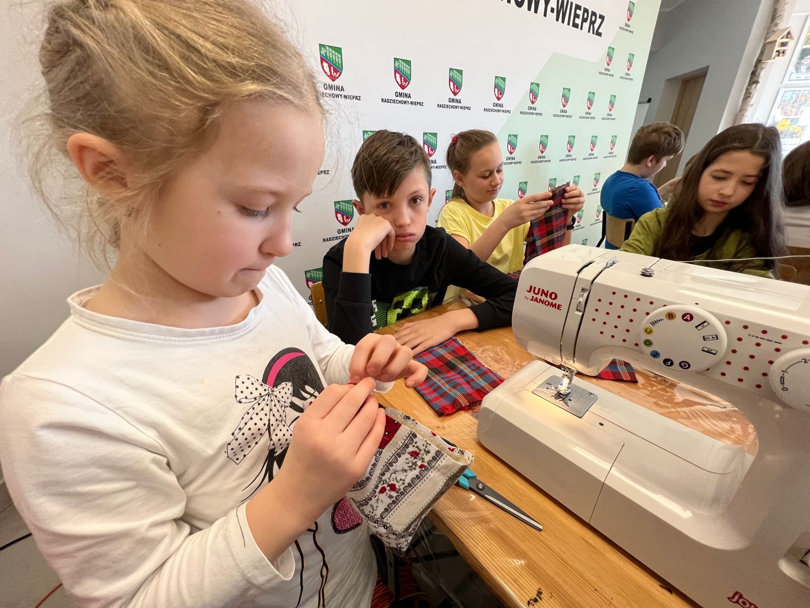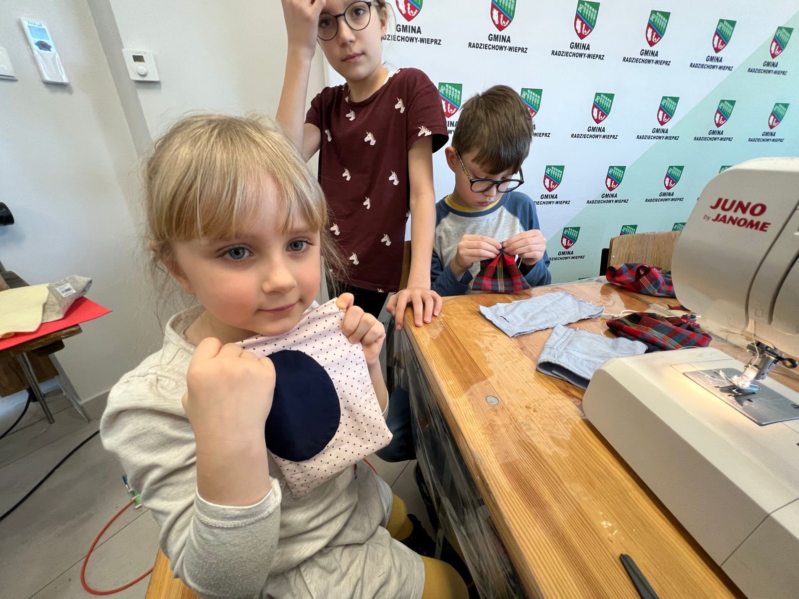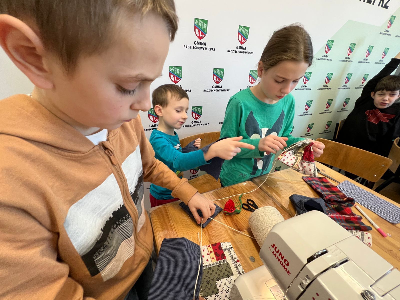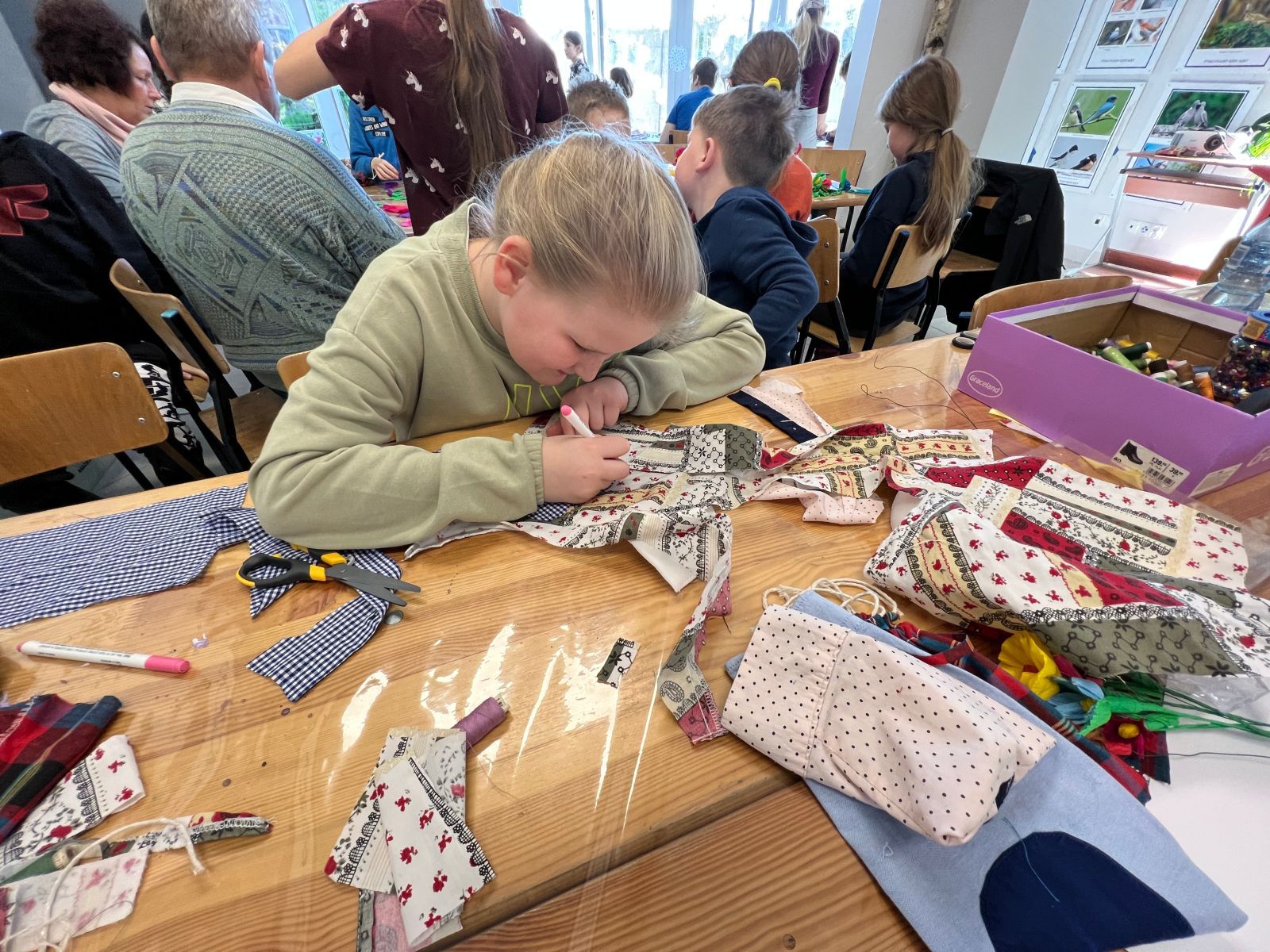 Prócz kwiatów z bibuły dzieci mogły uszyć woreczki na drobiazgi z różnych materiałów – jeansowe lub bawełniane. Kolory, wzory i kroje zachwycały a w szczególności pomysłowość dzieci. Materiały na worezki pochodziły z recyklingu a zajęcia miały na celu przedstawić dzieciom możliwości wykorzystania starych już niepotrzebnych ubrań.