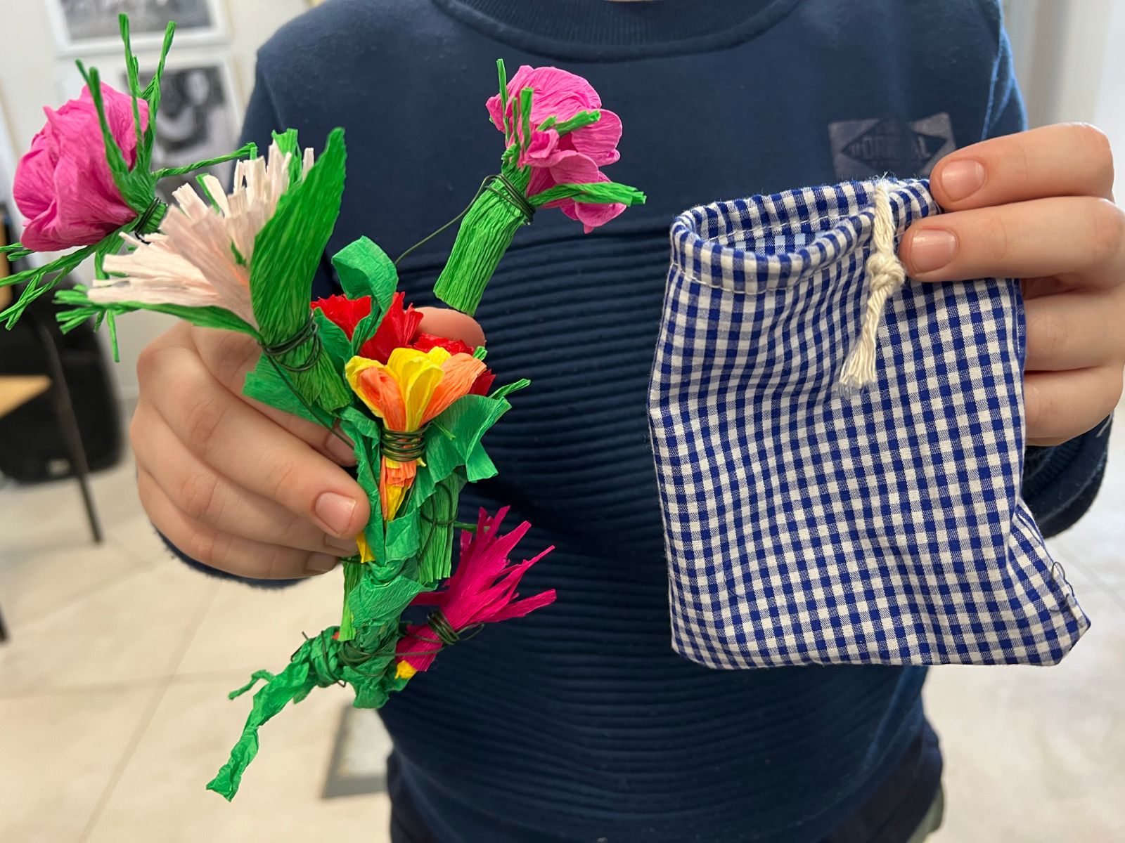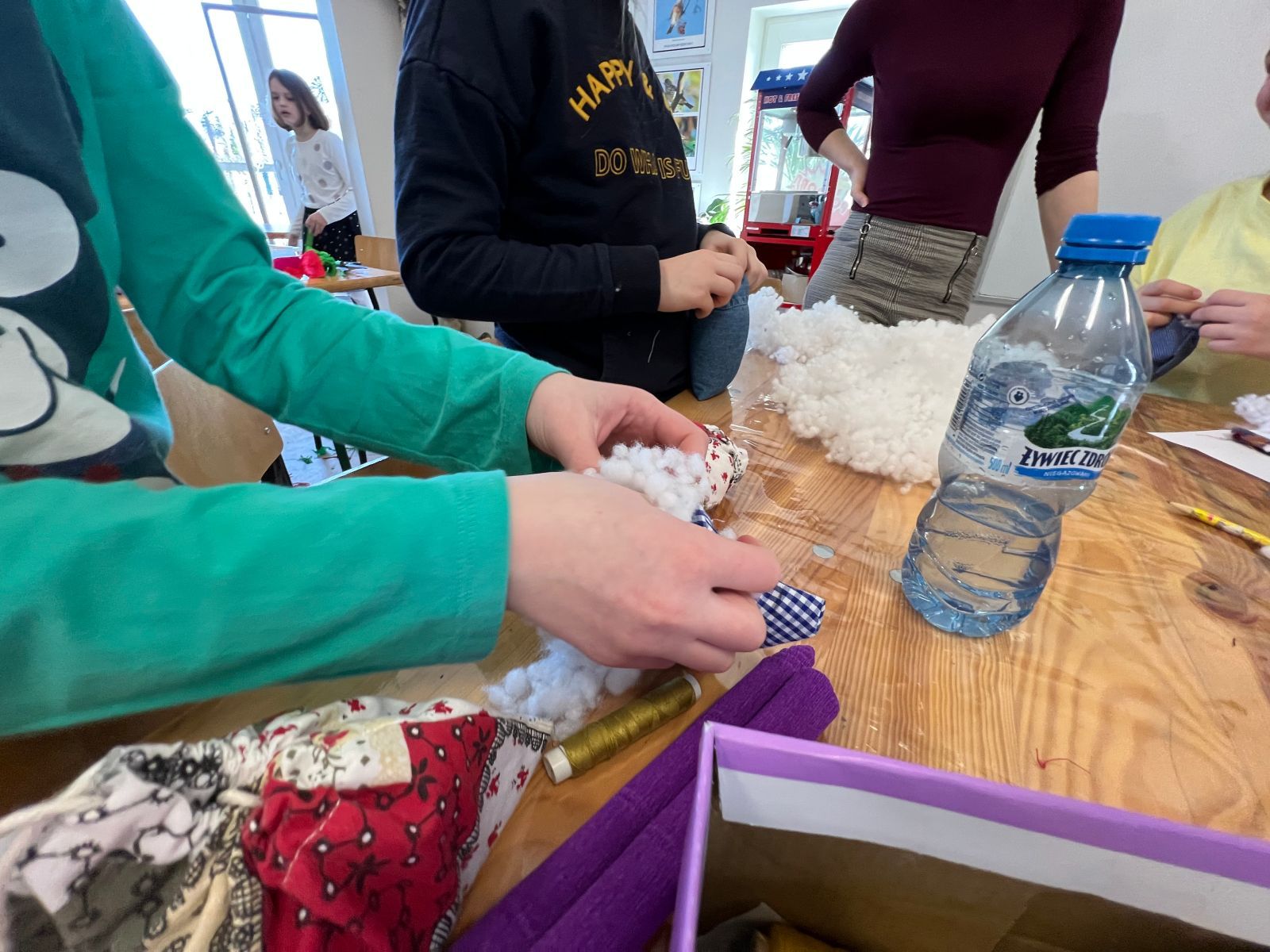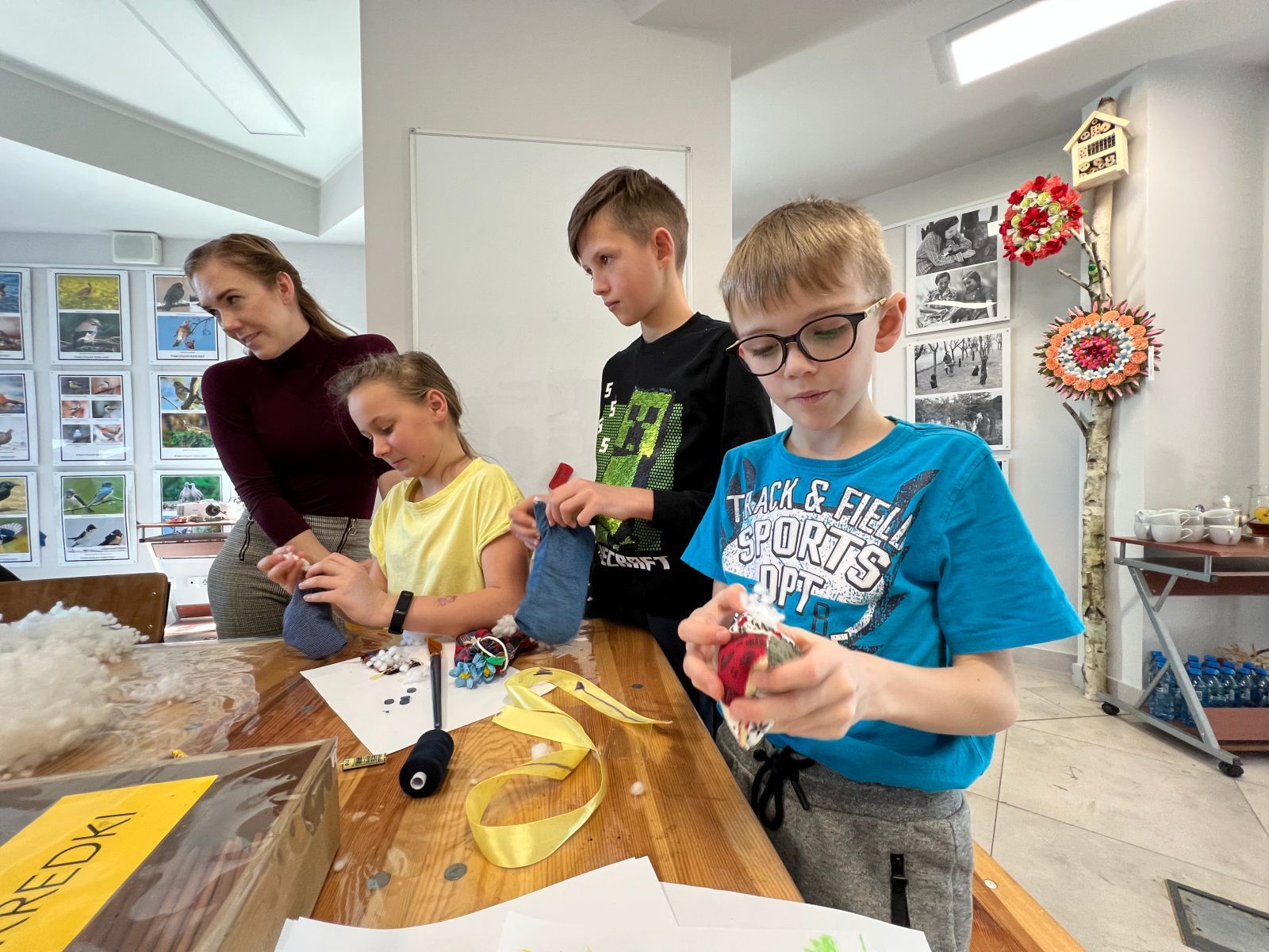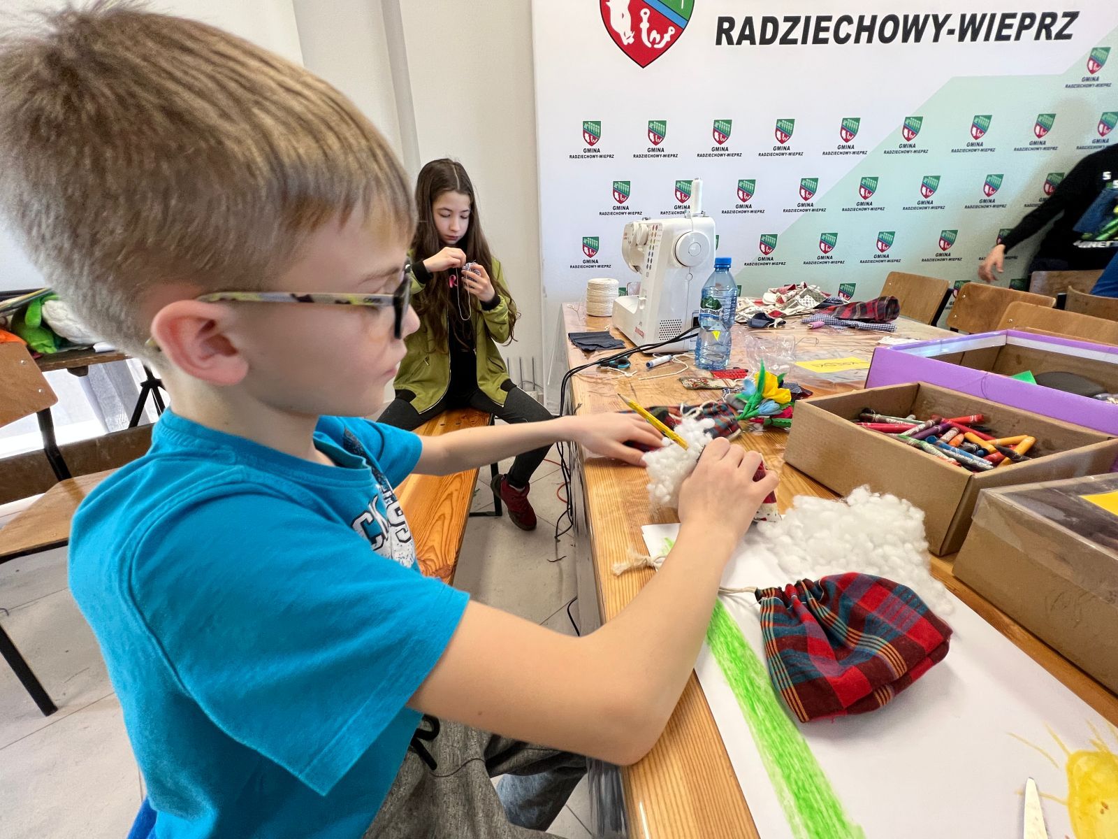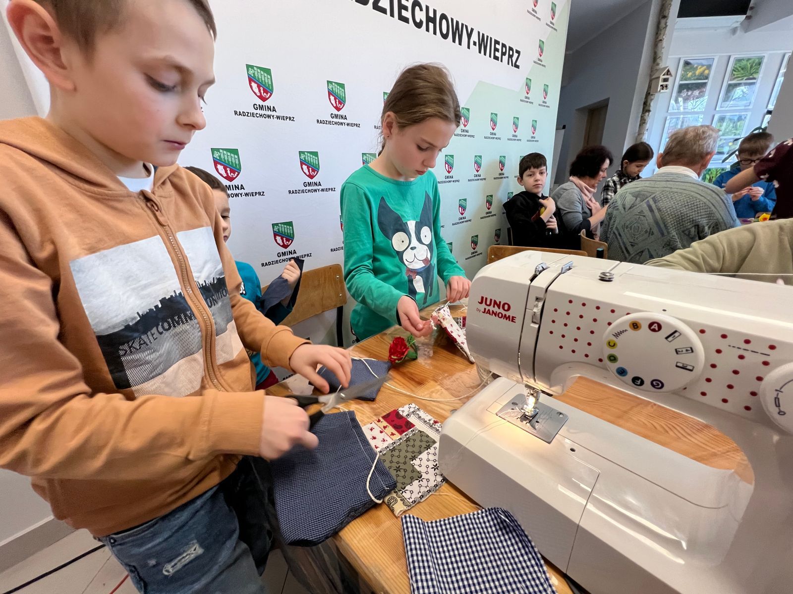 Prócz kwiatów z bibuły dzieci mogły uszyć woreczki na drobiazgi z różnych materiałów – jeansowe lub bawełniane. Kolory, wzory i kroje zachwycały a w szczególności pomysłowość dzieci. Materiały na worezki pochodziły z recyklingu a zajęcia miały na celu przedstawić dzieciom możliwości wykorzystania starych już niepotrzebnych ubrań.