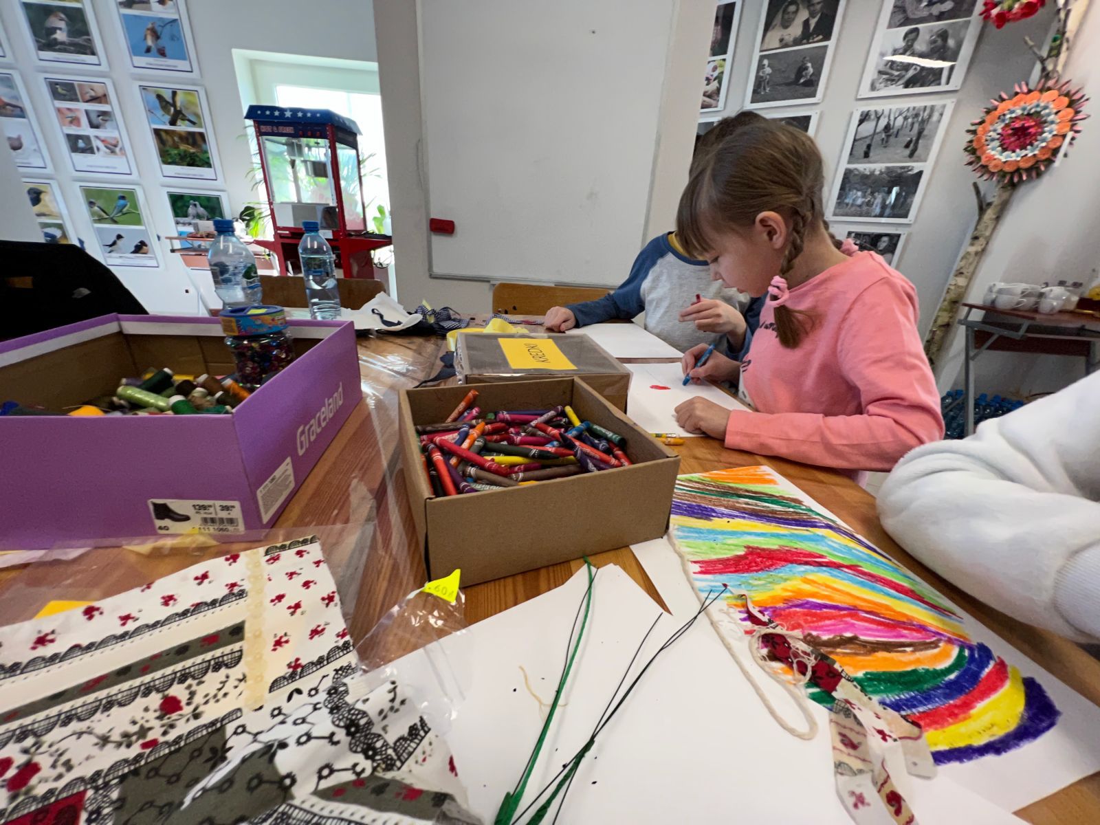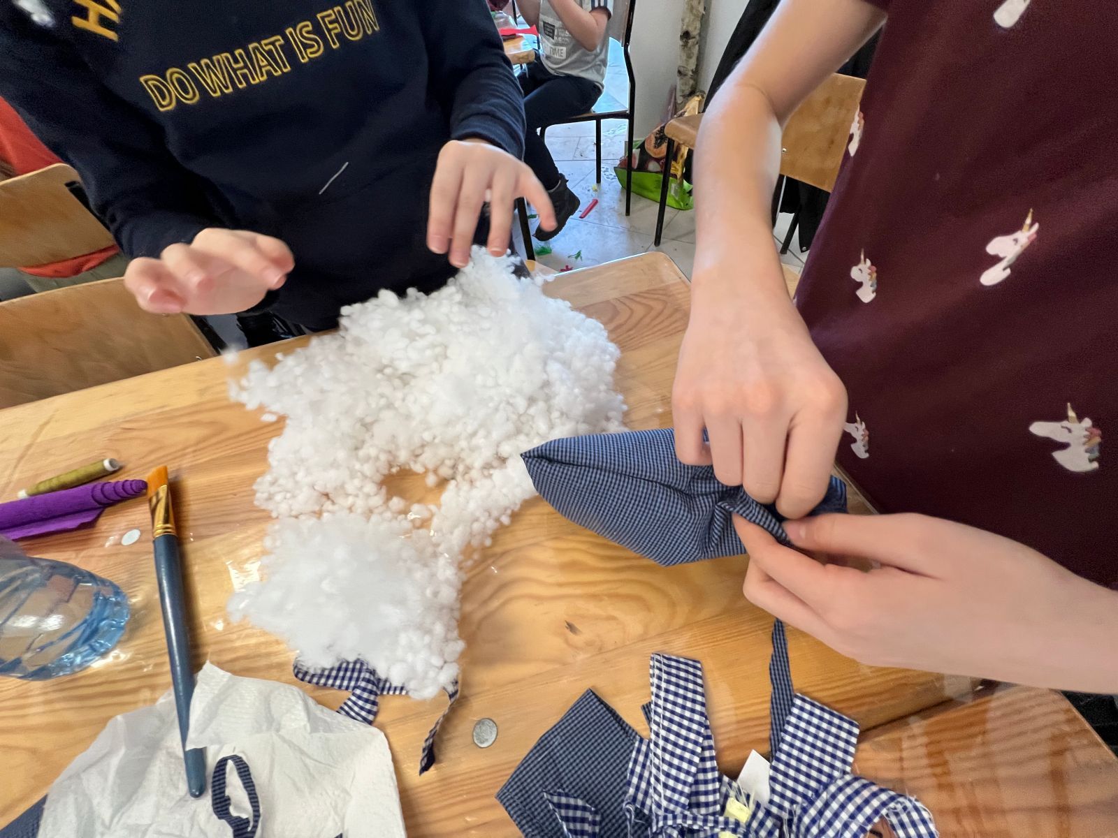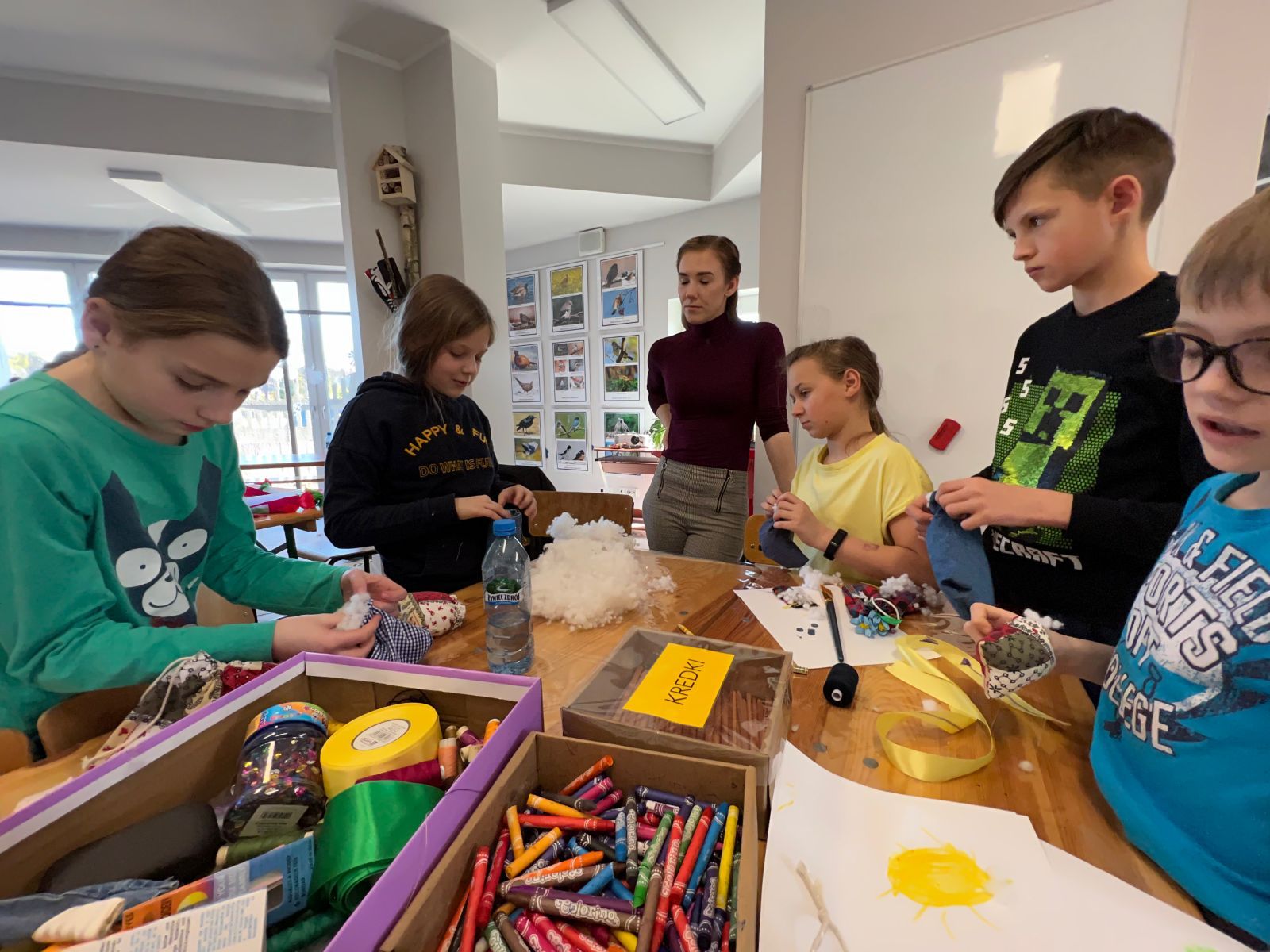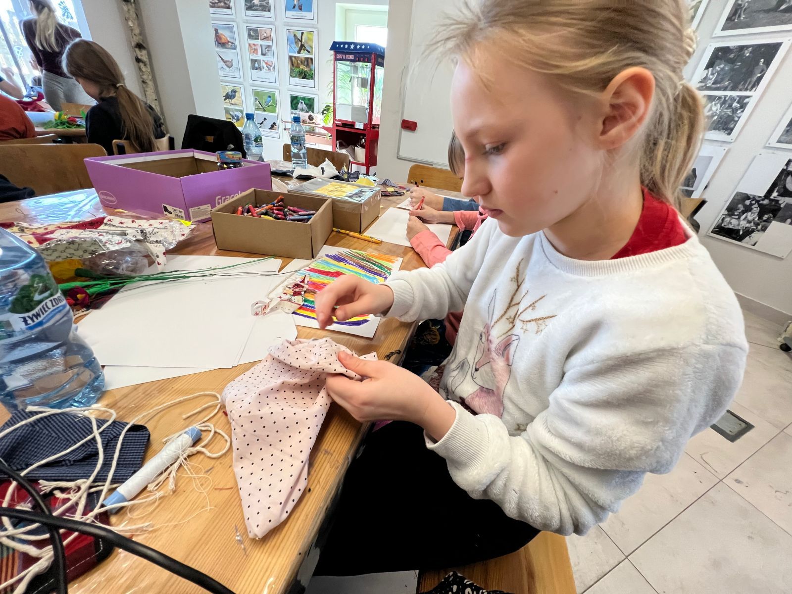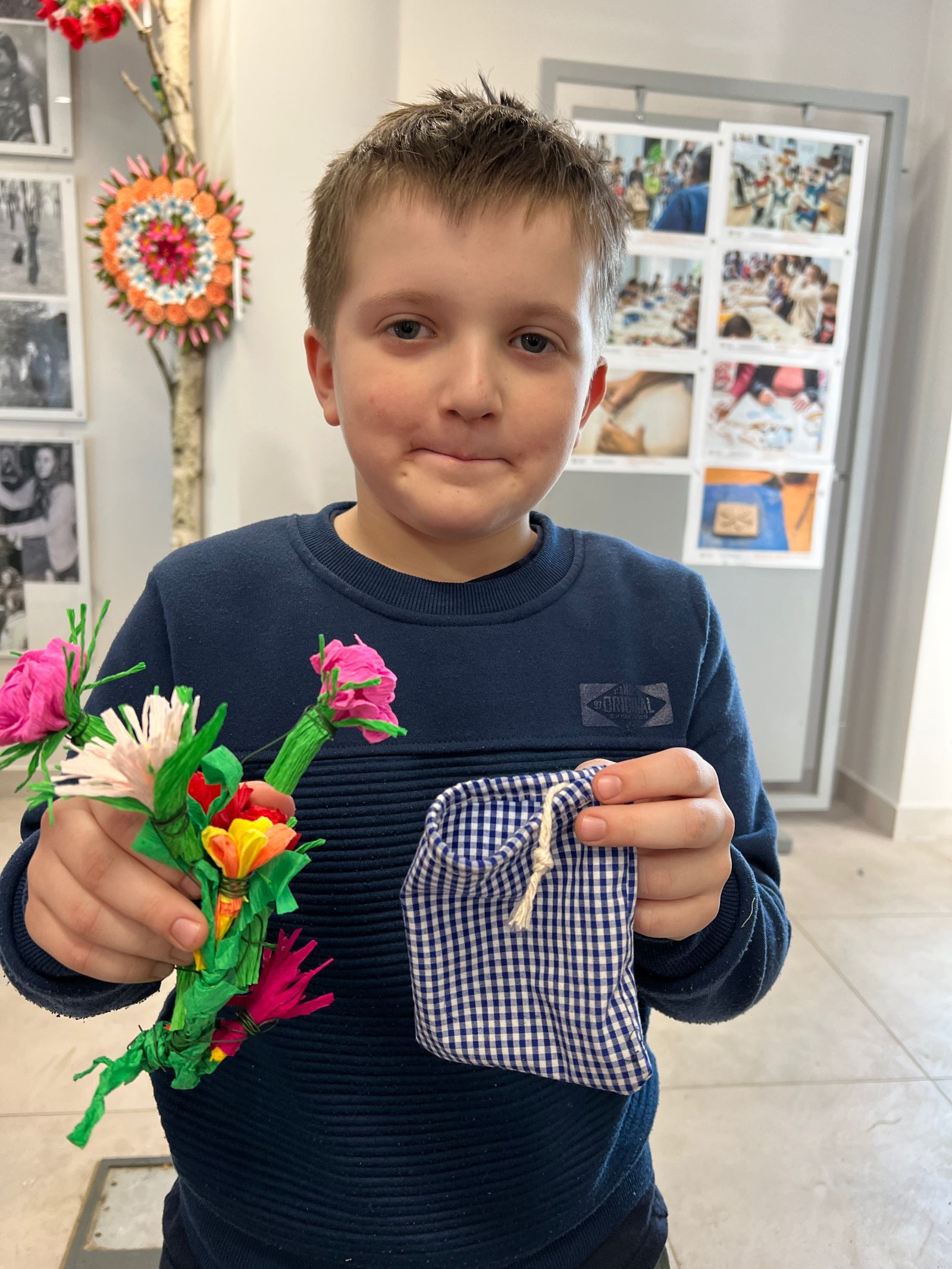 Prócz kwiatów z bibuły dzieci mogły uszyć woreczki na drobiazgi z różnych materiałów – jeansowe lub bawełniane. Kolory, wzory i kroje zachwycały a w szczególności pomysłowość dzieci. Materiały na worezki pochodziły z recyklingu a zajęcia miały na celu przedstawić dzieciom możliwości wykorzystania starych już niepotrzebnych ubrań.