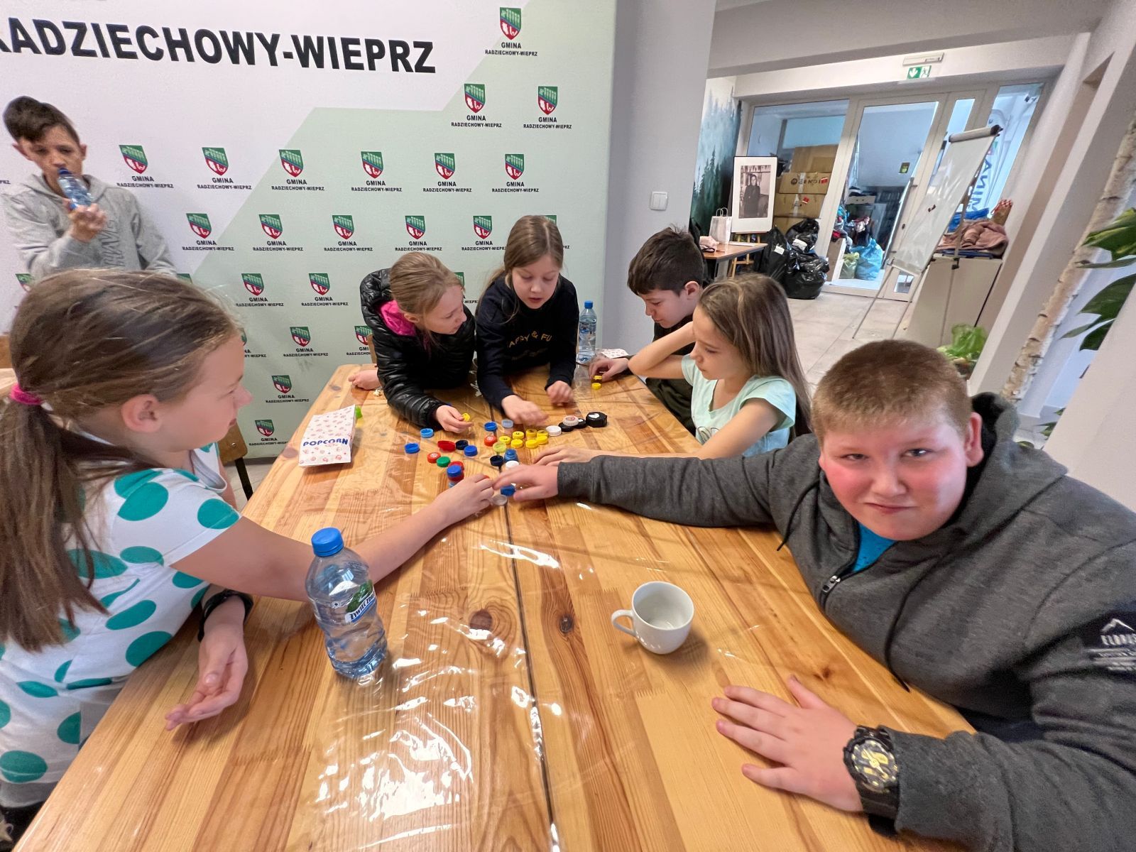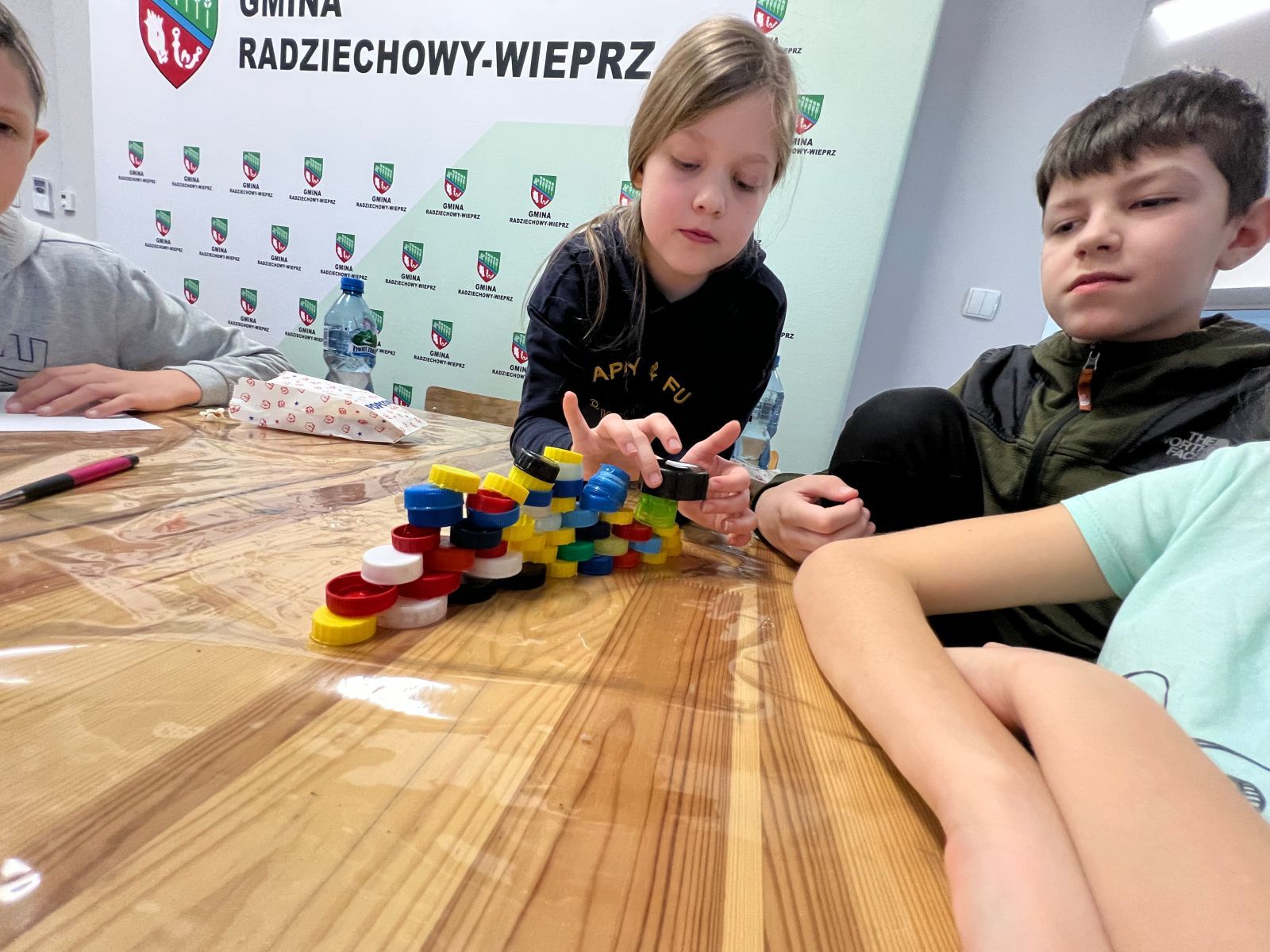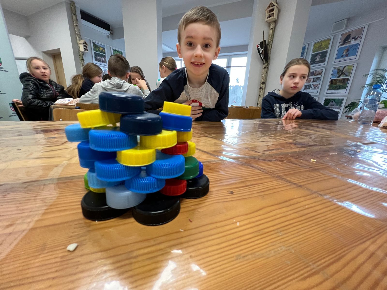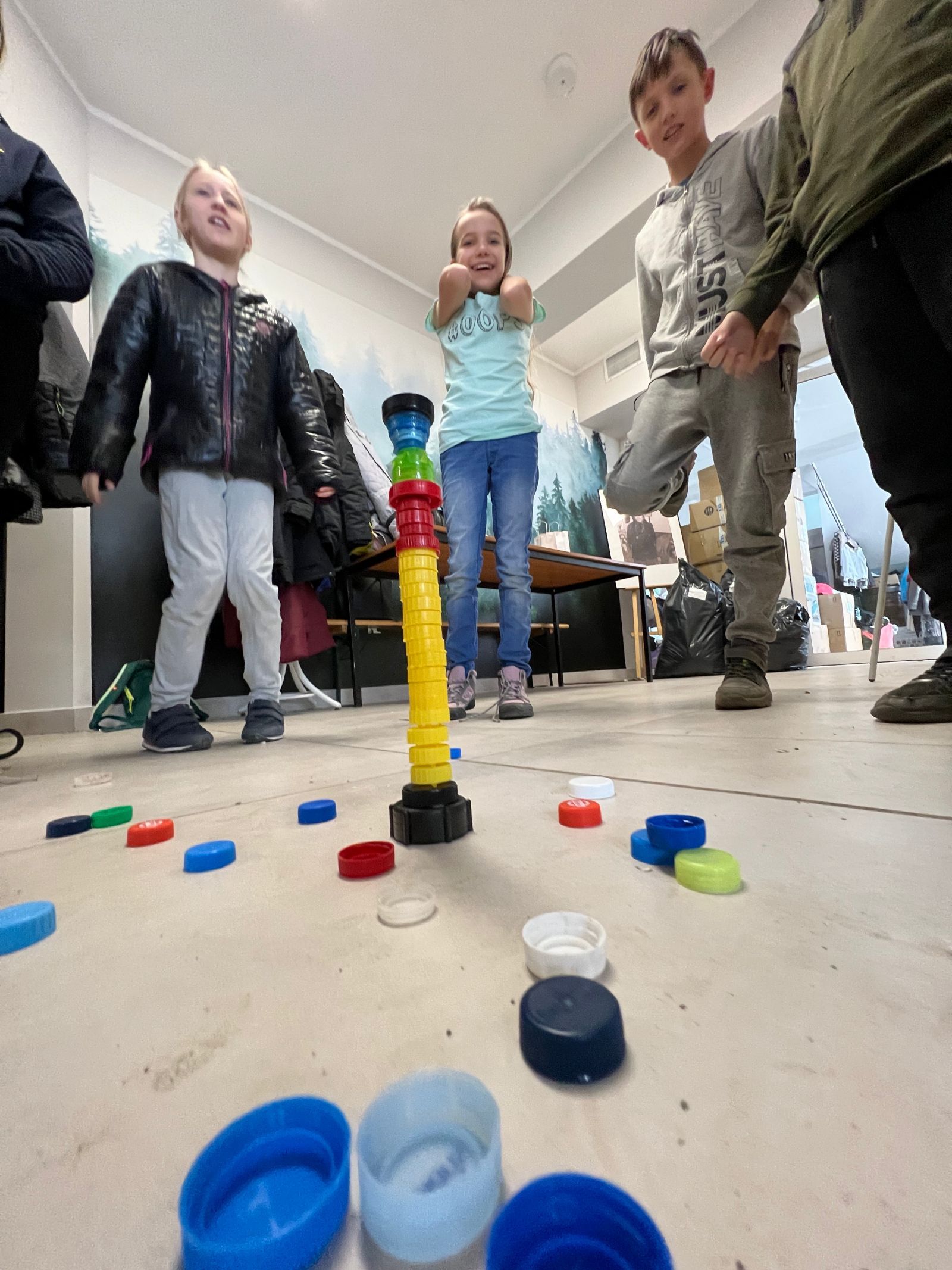 Na zakończenie ferii odbyły się zajęcia o tematyce „kreatywnej pracy w grupie”. Dzieciaki budowały wieżę z zakrętek – celem było wybudowanie jak największej.