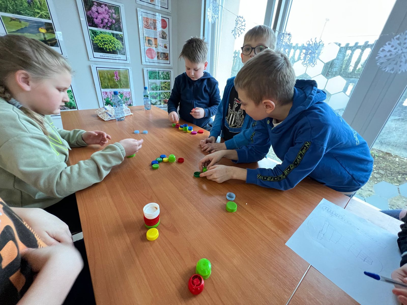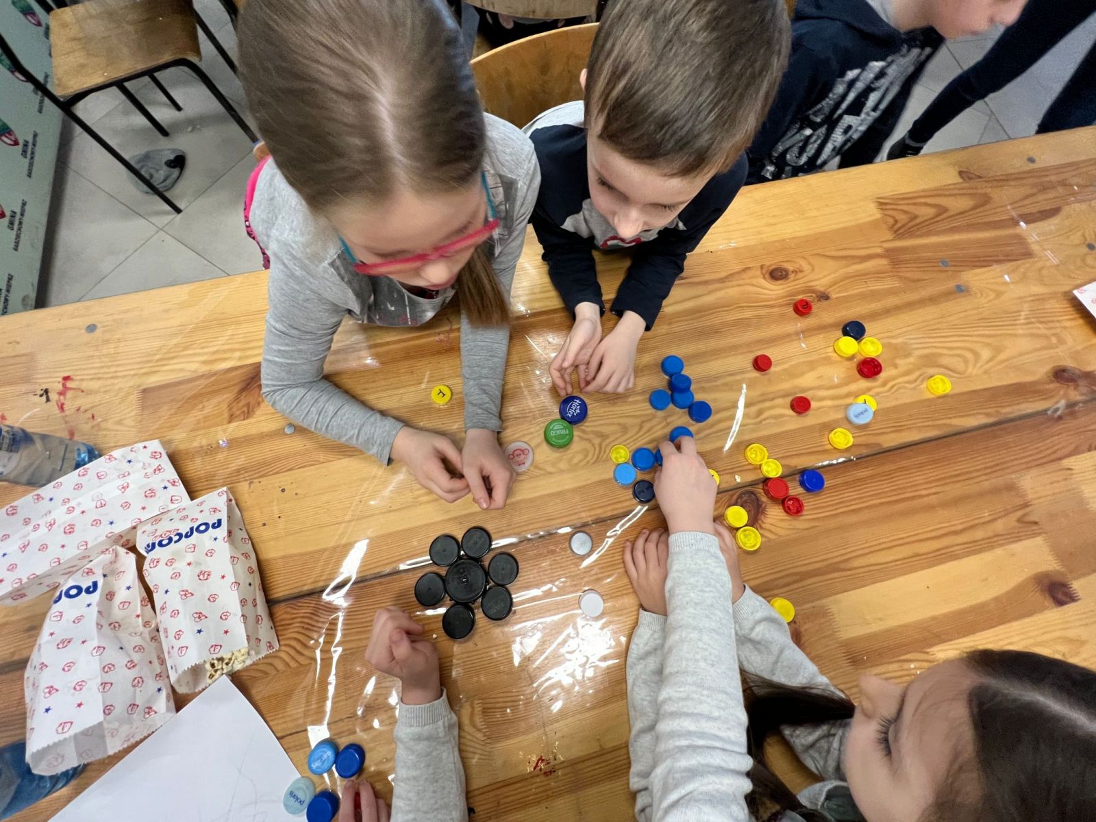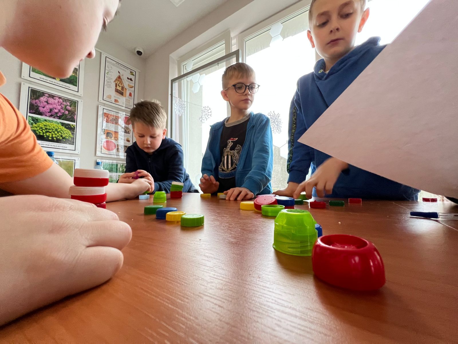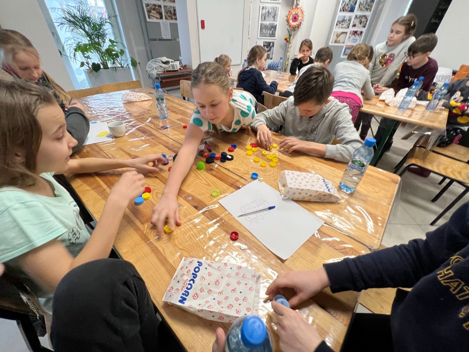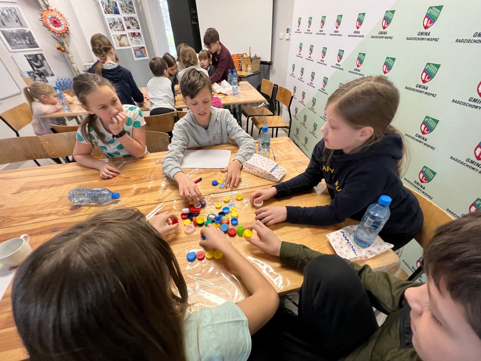 Na zakończenie ferii odbyły się zajęcia o tematyce „kreatywnej pracy w grupie”. Dzieciaki budowały wieżę z zakrętek – celem było wybudowanie jak największej.