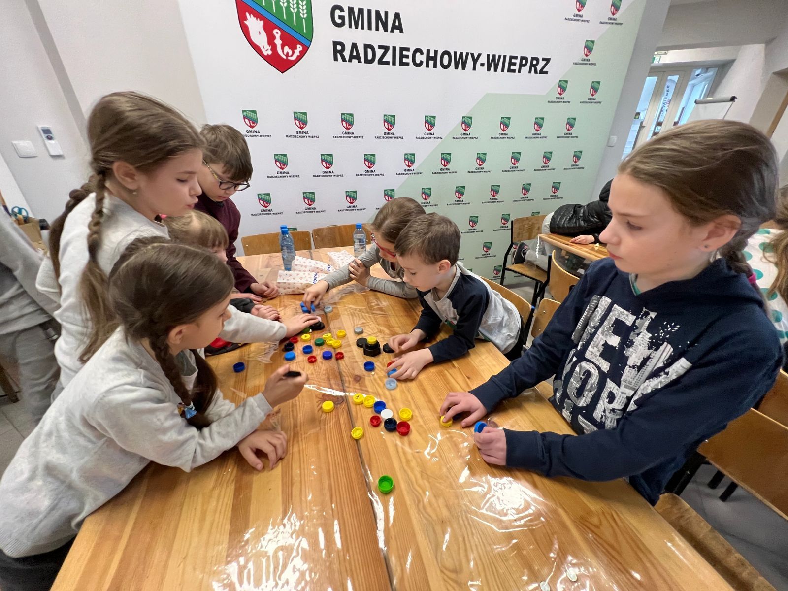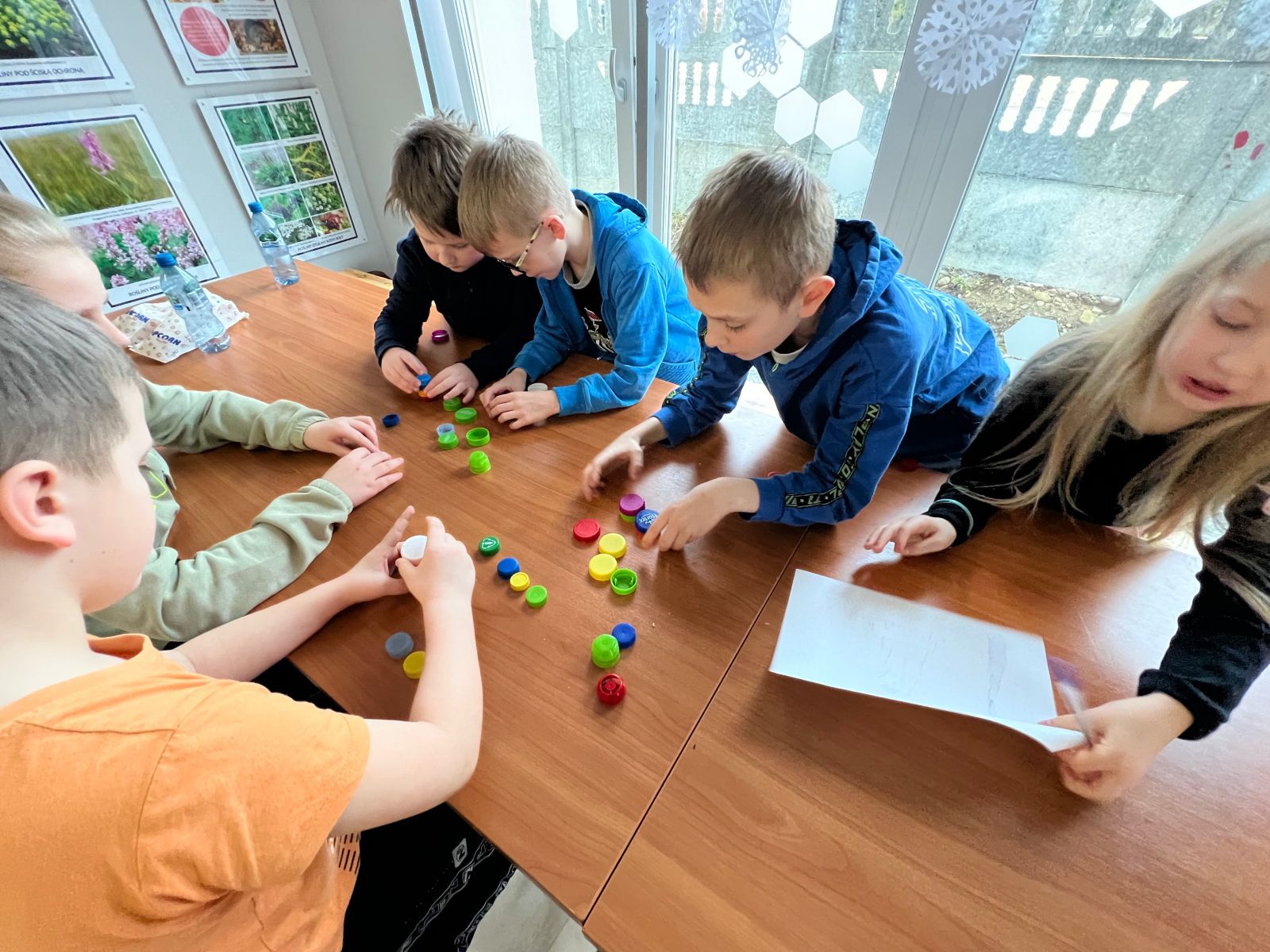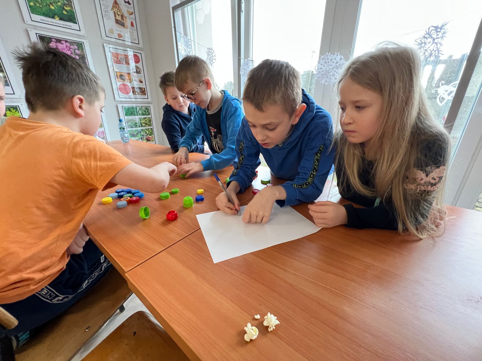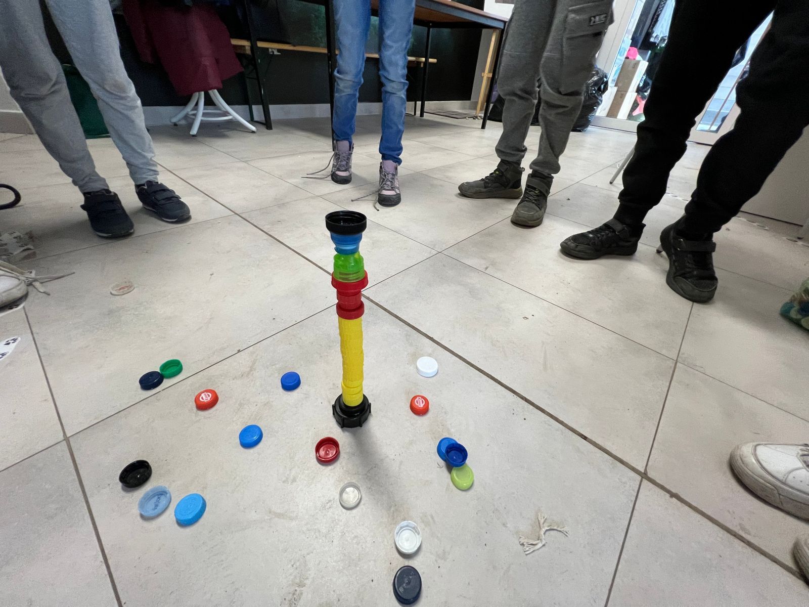 Na zakończenie ferii odbyły się zajęcia o tematyce „kreatywnej pracy w grupie”. Dzieciaki budowały wieżę z zakrętek – celem było wybudowanie jak największej.