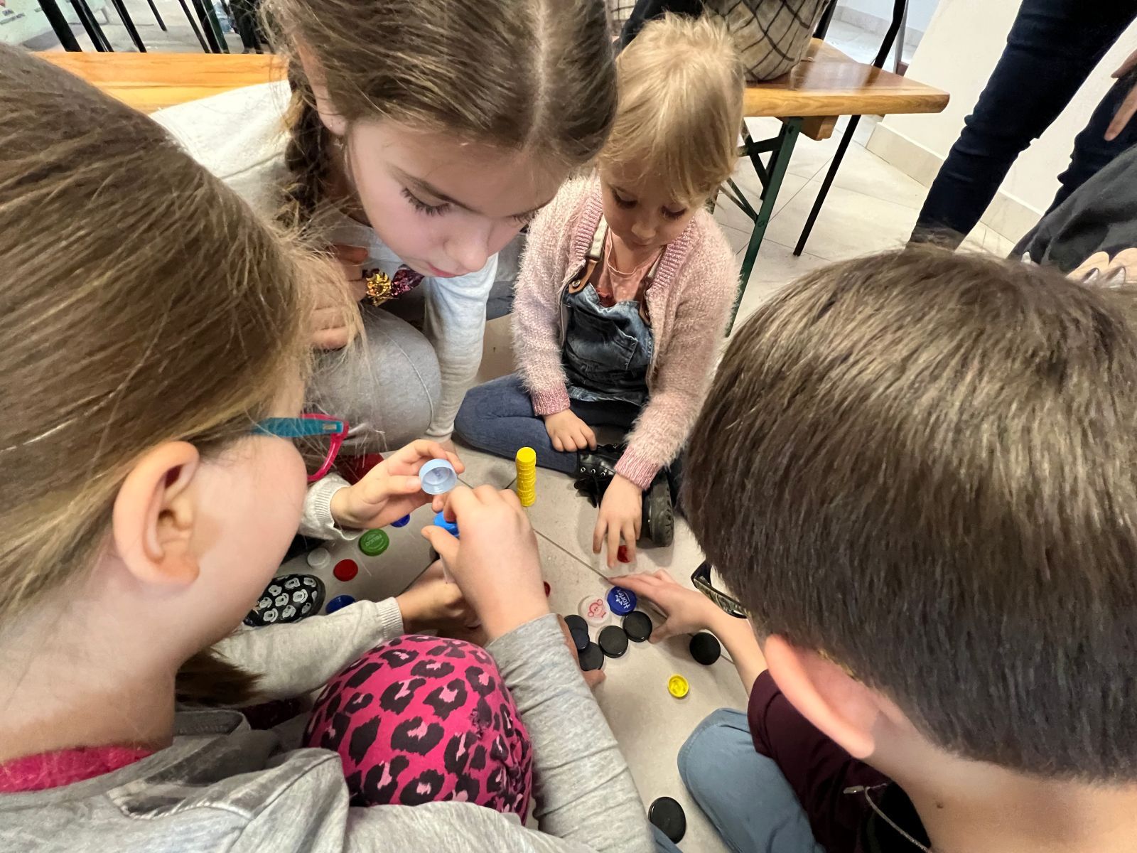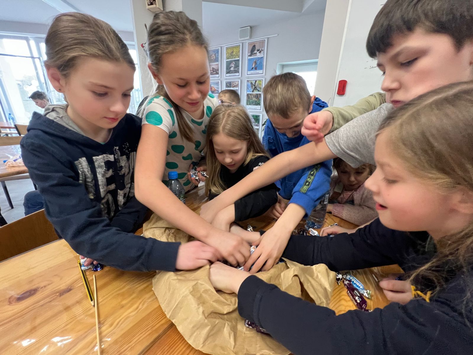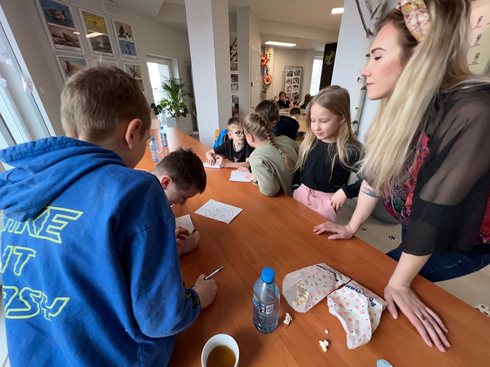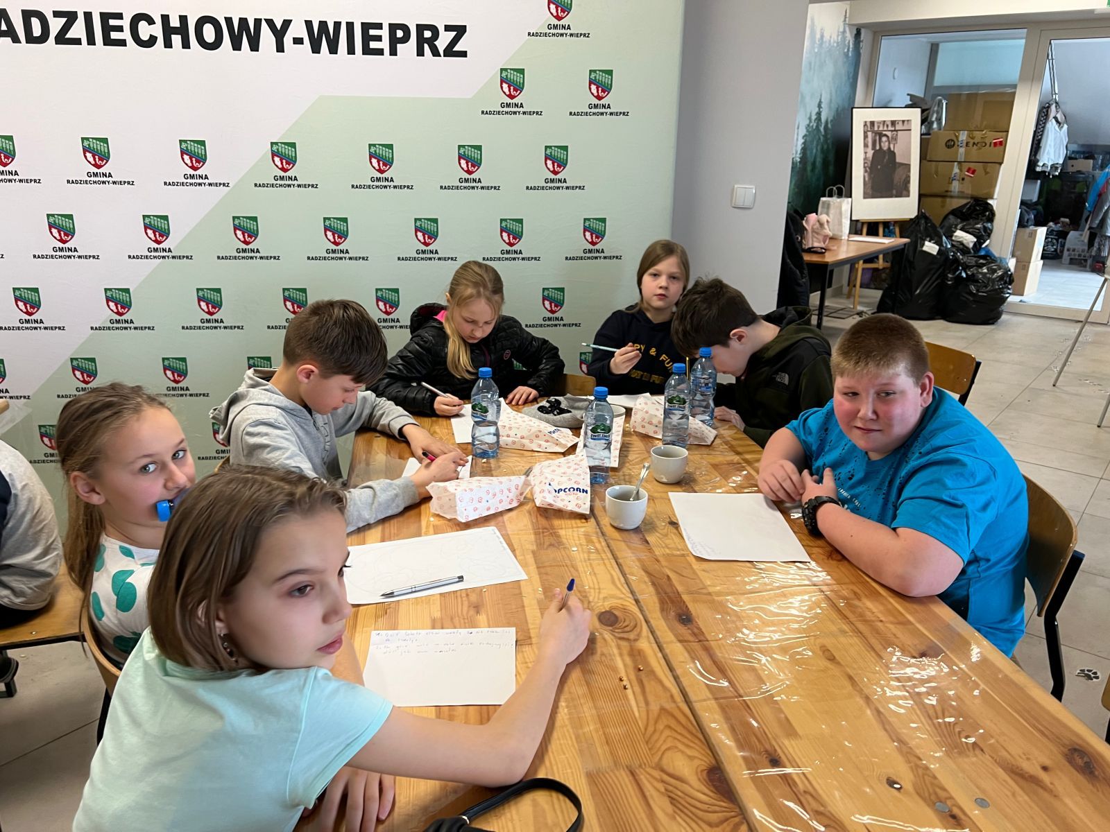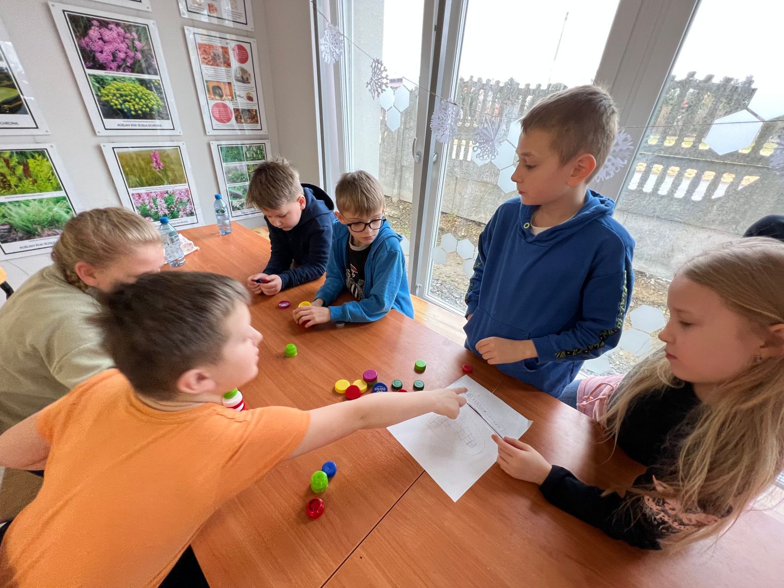 Na zakończenie ferii odbyły się zajęcia o tematyce „kreatywnej pracy w grupie”. Dzieciaki budowały wieżę z zakrętek – celem było wybudowanie jak największej.